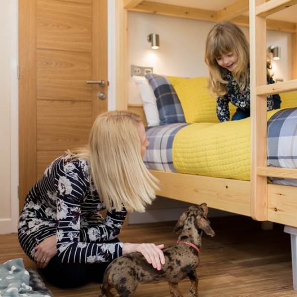 Our Family Cabins sleep 2 adults and 2 children (up to 12 years) in a kingsize bed with two single bunks overhead - bed linen & towels are provided.