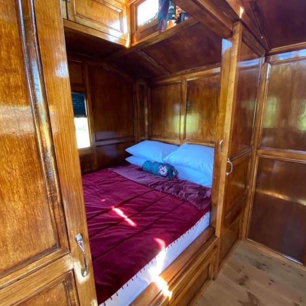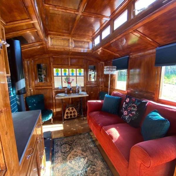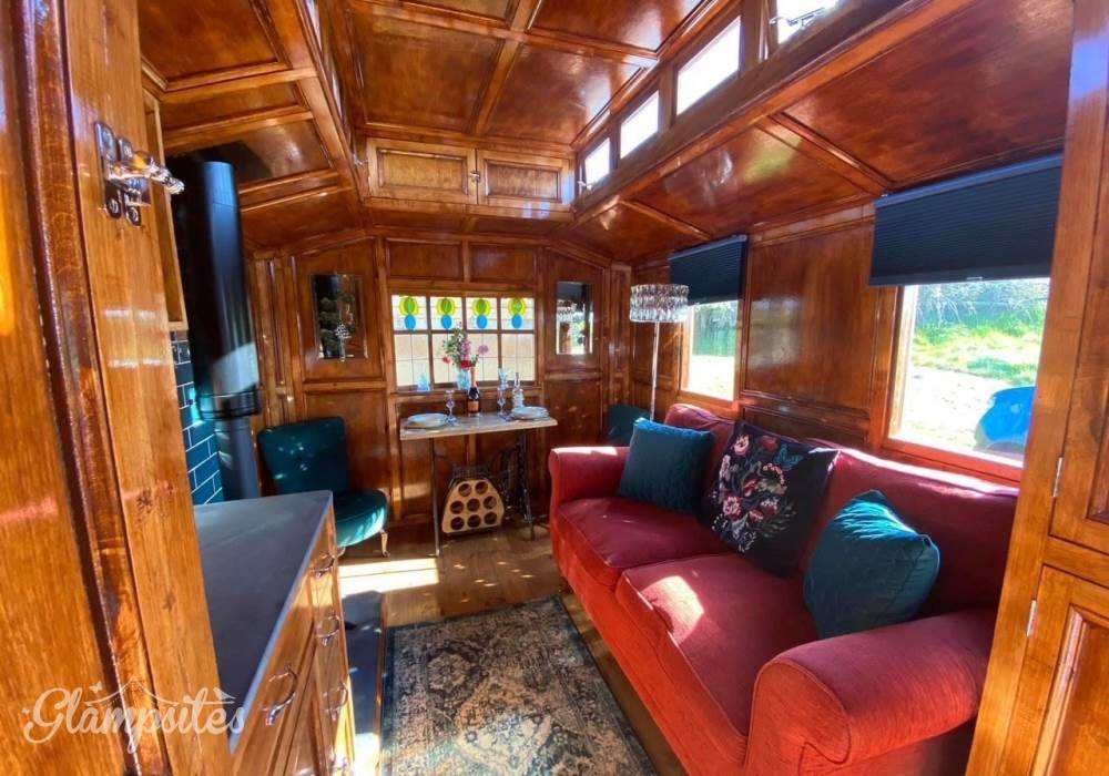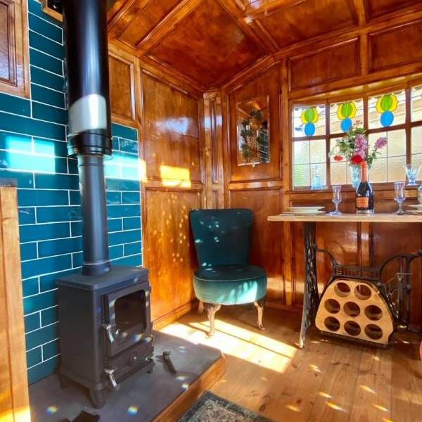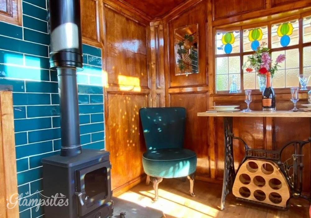 Inside Esmerelda is a double cupboard bed with bedding and blankets, 5amp plug socket, 2 USB charging points and electric kettle and fridge. She has a wood burning stove to keep you cosy and warm and the sound of the crackling fire provides the perfect background noise for reading by the fire.