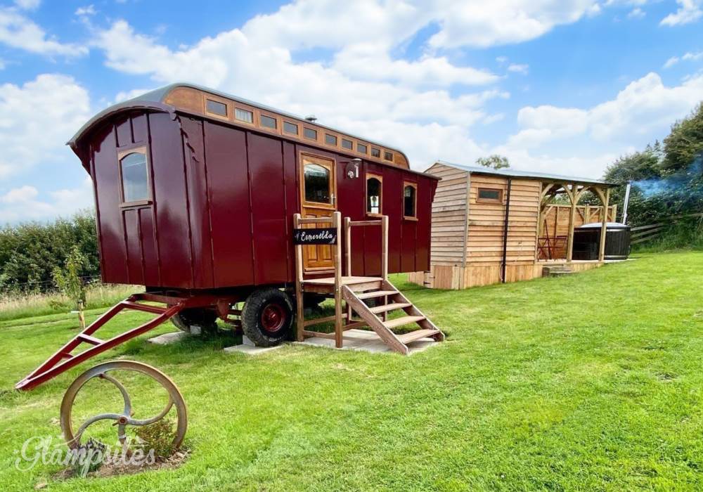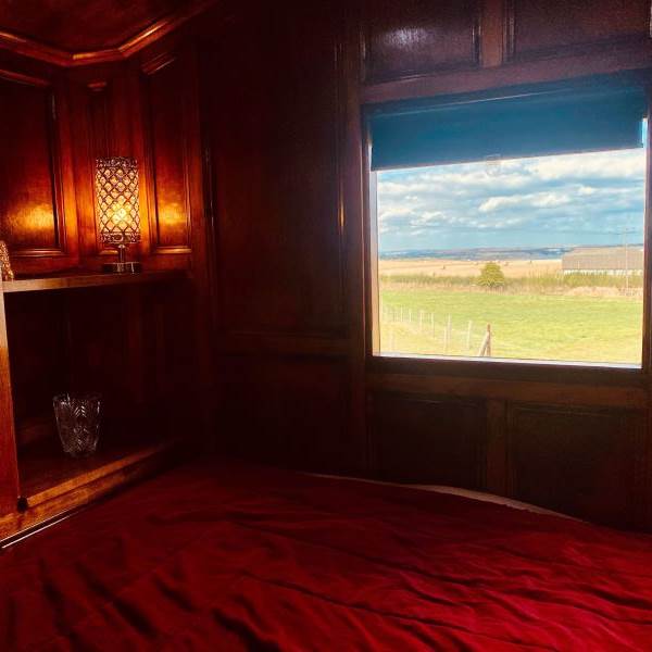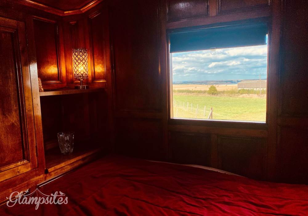 Esmeralda was handcrafted in our workshop and finished with vintage décor to replicate that of an original showman wagon, providing self catering, glamping accommodation for two adults. Proudly positioned at the top of our field on our family farm in her own enclosed space with views looking out to Filey Bay and across the donkey field out to open countryside.