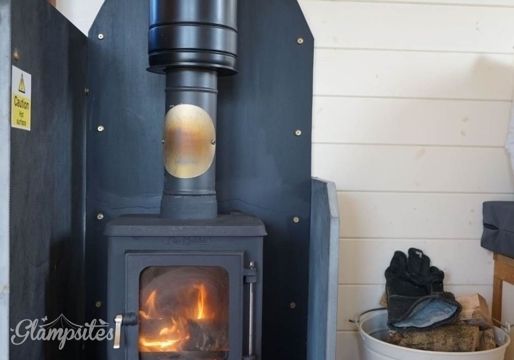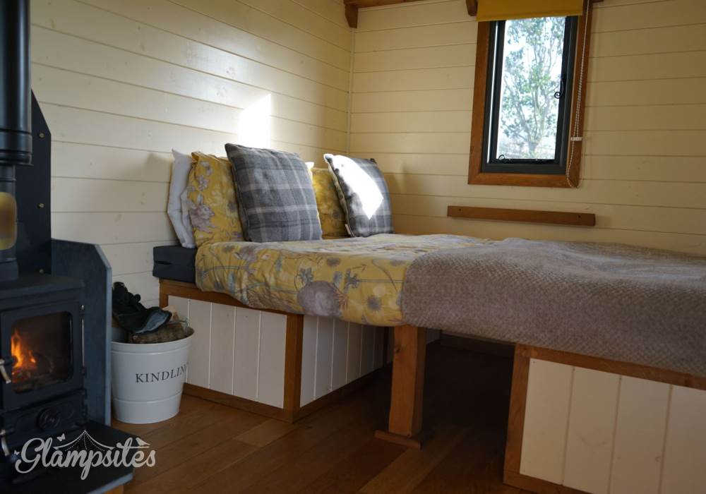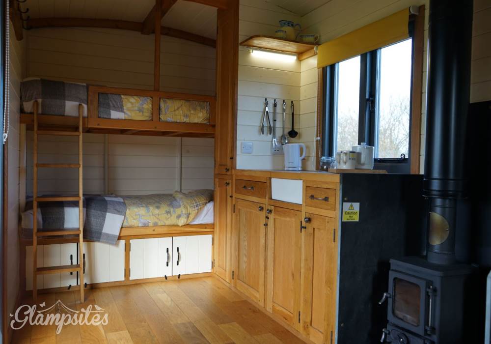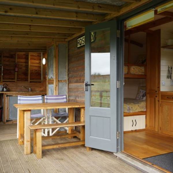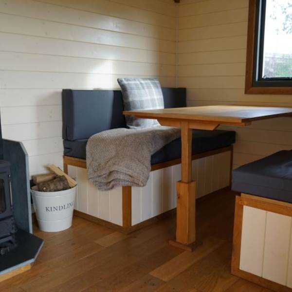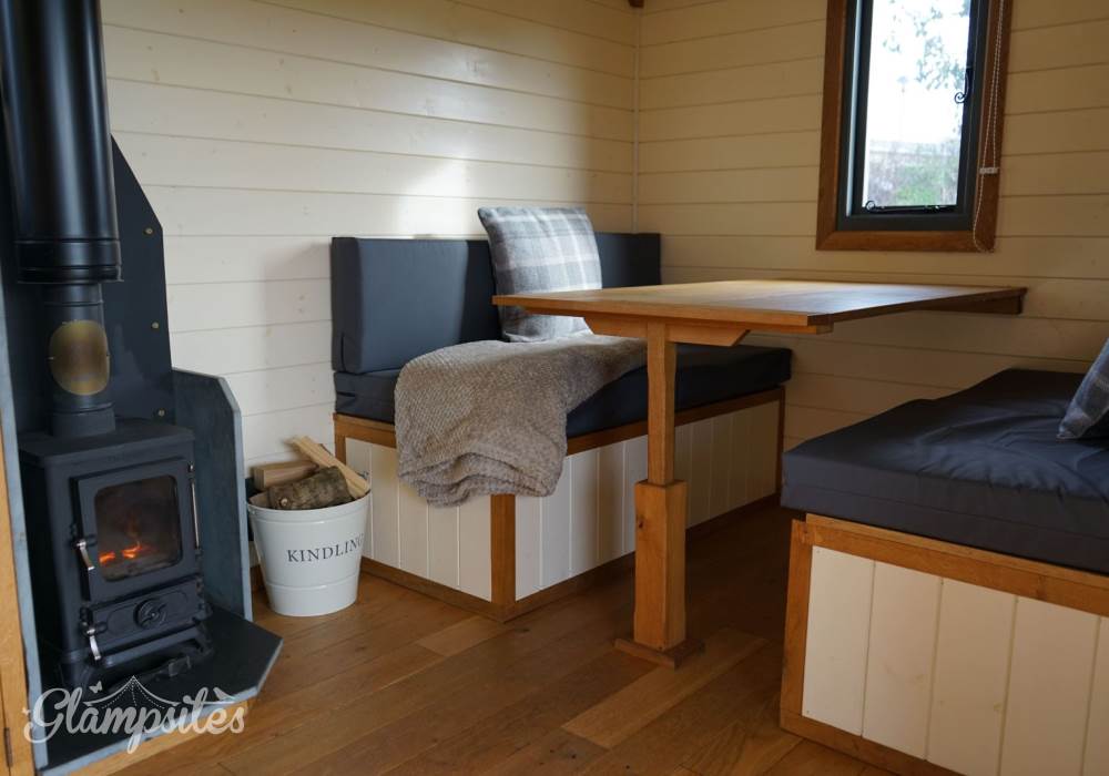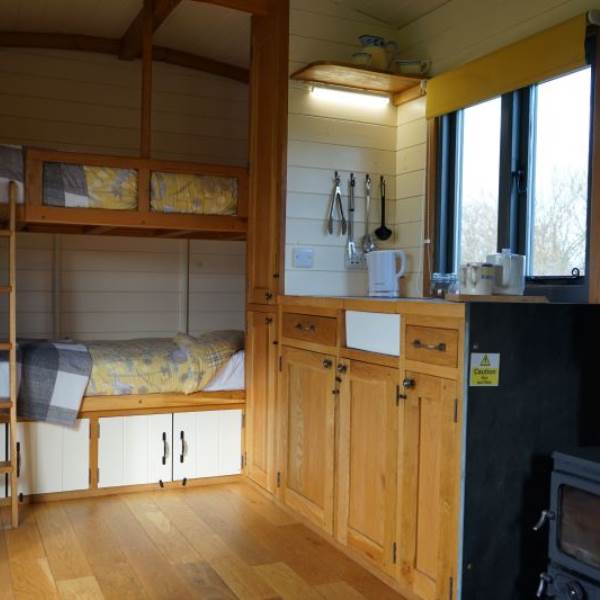 Inside Rosebay is a cosy dining area which is easily converted into a double bed and bunk beds with bedding and blankets, electric kettle and fridge, 5amp plug socket and usb charging point. She also has a wood burning stove to warm warm you back up after long days on the beach,