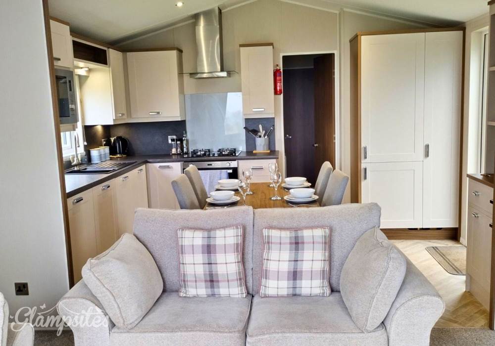 Our self-catering luxury lodges feature everything you need for a countryside break away, with a luxurious master bedroom boasting a walk-in wardrobe, en-suite with shower and dressing table with mirror. The twin Bedroom features bedside cabinets, plenty of storage space with the family bathroom opposite. In the spacious fully fitted kitchen area, you'll also find a dining table and 4 chairs. A spare foldup chair can be found in the cupboard next to the fridge. Also included with the fridge/freezer, is a 4 hob gas stove, oven, microwave, dishwasher, washing machine, iron and ironing board.