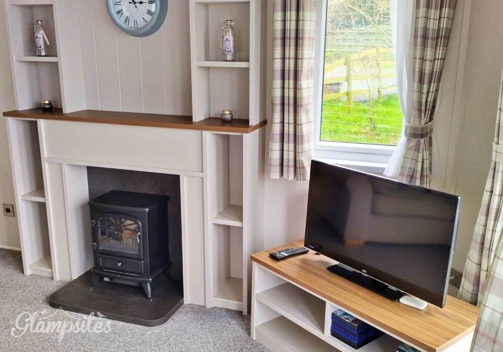 The living room contains two plush sofas (one converts to a small double bed), a TV/DVD player, and electric fireplace. Floor-to-ceiling windows showcase views of the livery fields and Fownhope valley. Please ensure you book the correct party size to ensure bedding gets provided for the sofabed.