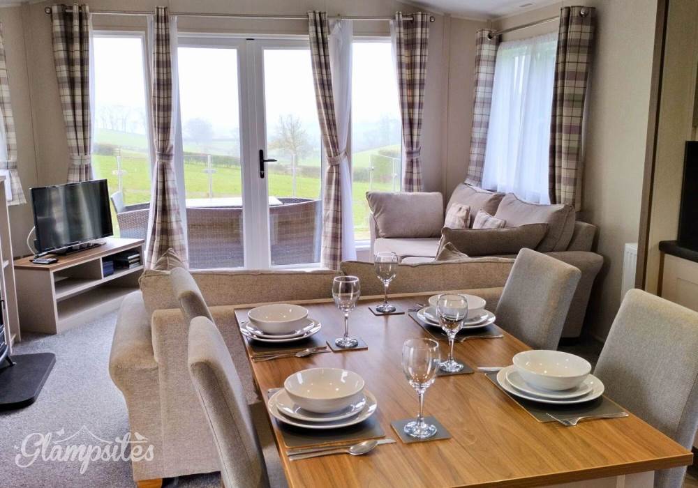 The living room contains two plush sofas (one converts to a small double bed), a TV/DVD player, and electric fireplace. Floor-to-ceiling windows showcase views of the livery fields and Fownhope valley. Please ensure you book the correct party size to ensure bedding gets provided for the sofabed.