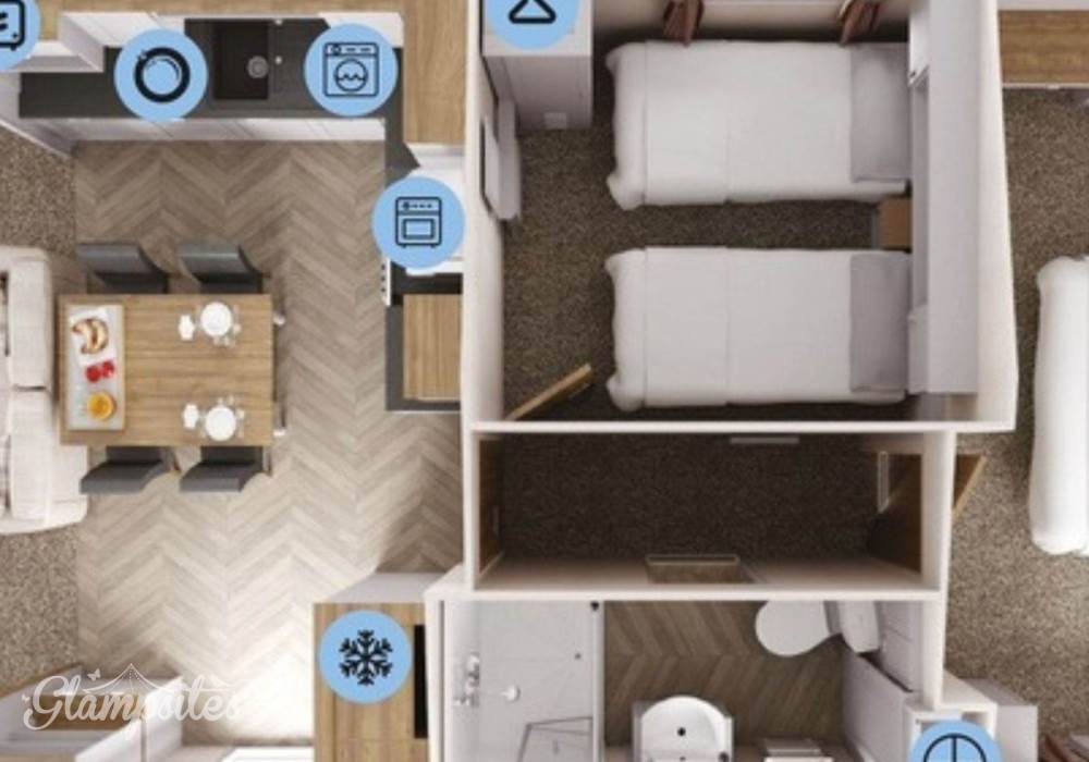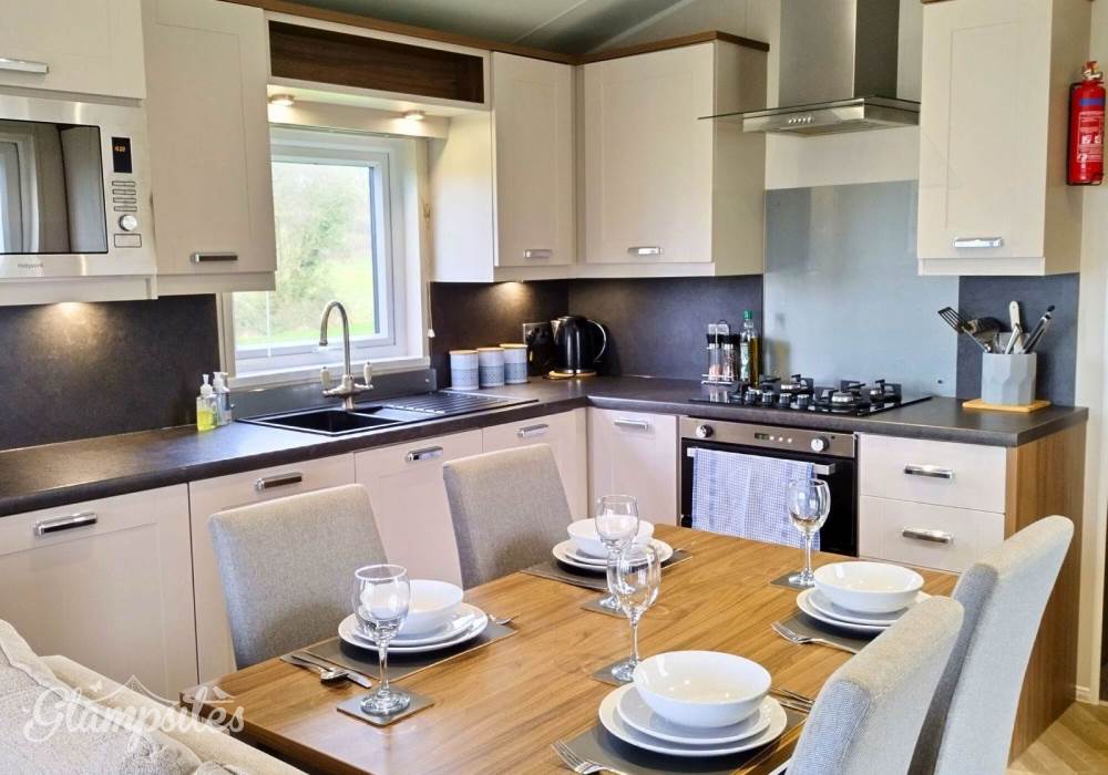 Our self-catering luxury lodges feature everything you need for a countryside break away, with a luxurious master bedroom boasting a walk-in wardrobe, en-suite with shower and dressing table with mirror. The twin Bedroom features bedside cabinets, plenty of storage space with the family bathroom opposite. In the spacious fully fitted kitchen area, you'll also find a dining table and 4 chairs. A spare foldup chair can be found in the cupboard next to the fridge. Also included with the fridge/freezer, is a 4 hob gas stove, oven, microwave, dishwasher, washing machine, iron and ironing board.