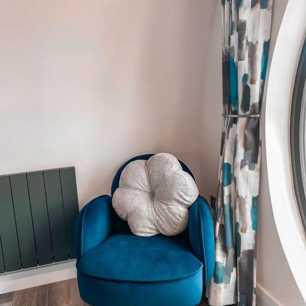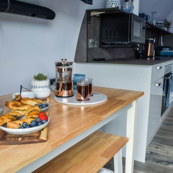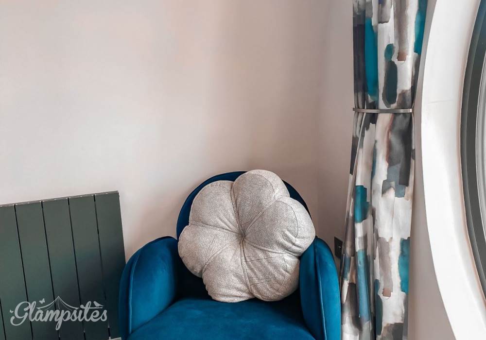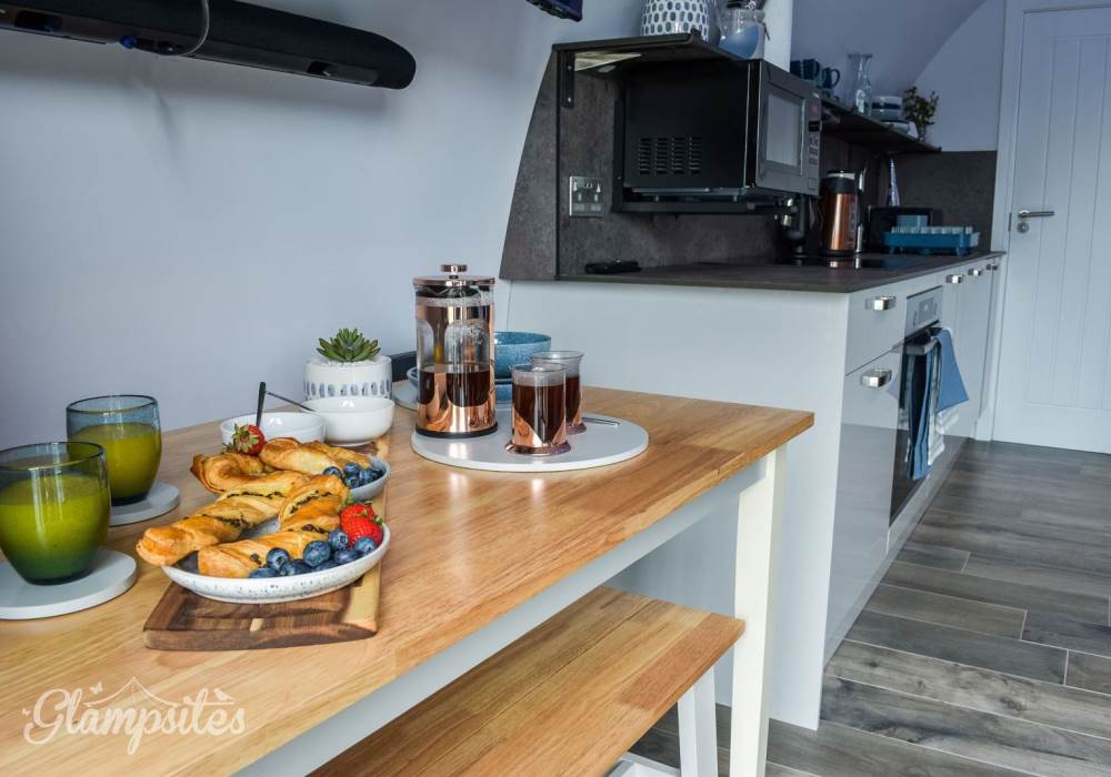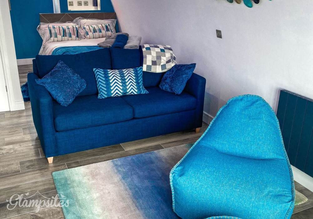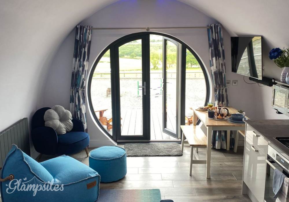 The living area features a smart TV, music sound bar, comfortable sofa and bean bag set, perfect for putting your feet up. Breath taking views of Durham Valley and our farmland can be enjoyed from all areas of the pod.