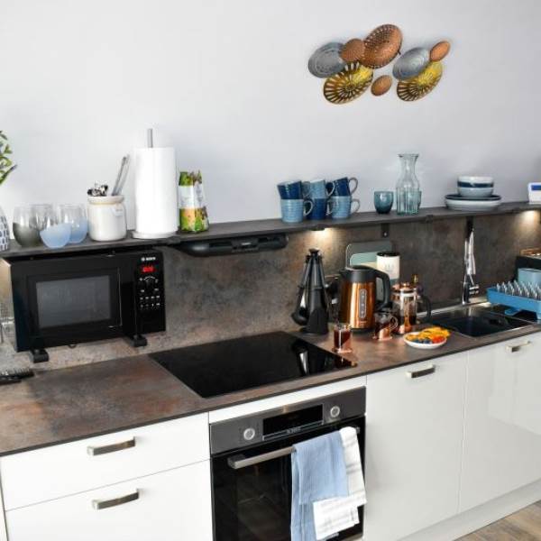The well thought out modern kitchen ensures you have everything you need during your stay, such as crockery, bottle openers, glasses, kettle, microwave and fridge/freezer.