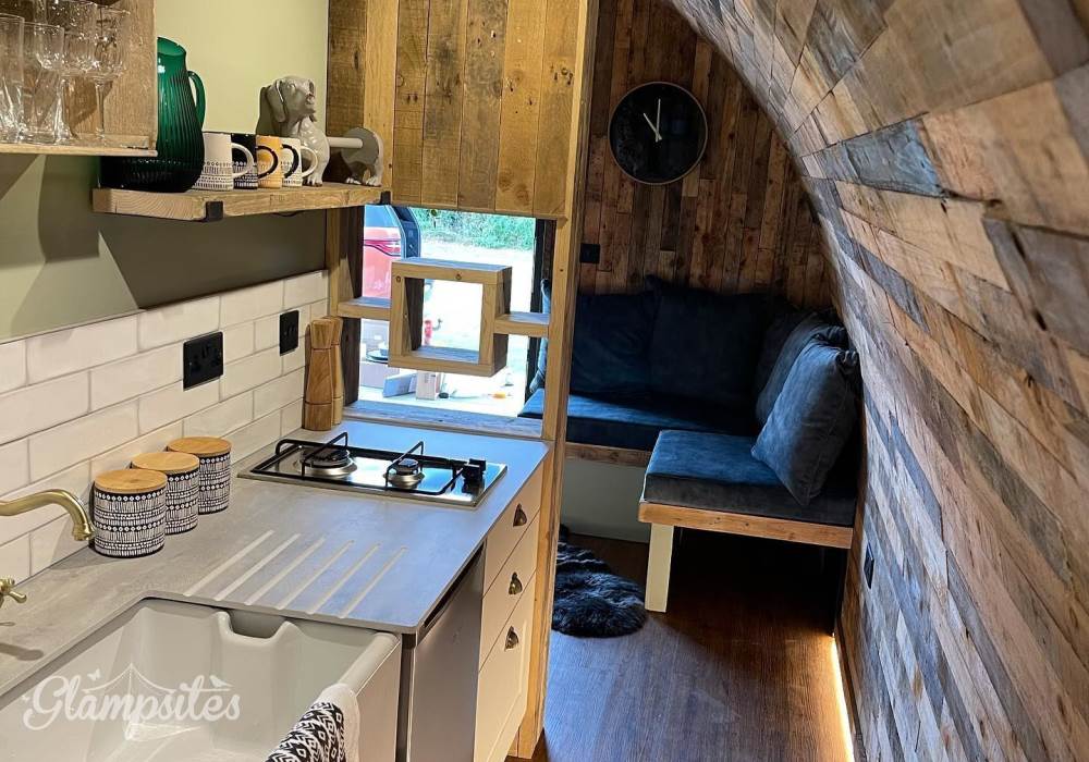 In each pod there is a spacious shower room with a large power shower, flushing toilet and large mirror. Adjacent to the bathroom is the galley kitchen which includes a full-sized Belfast sink, fridge with freezer box, 2 ring gas hob, cupboard space, cutlery, plates, bowls, glasses and everything you should need to cook and prepare a simple meal. At the front of the pod are the two seating areas – one for dining with bench seating and table and across from this a more comfortable area to relax and read a book or put your feet up and watch a film on the SMART TV. Other modern comforts include free Wi-Fi, underfloor heating throughout, sockets, stylish interior, luxurious mattresses and bedding, towels, full length mirror, tea and coffee making facilities including camping kettle for use on the gas hob, mood lighting throughout, outdoor picnic bench, Firepit/BBQ, decking, and a large grassed area in front of the pod for all to enjoy. Dogs are welcome (2 max)