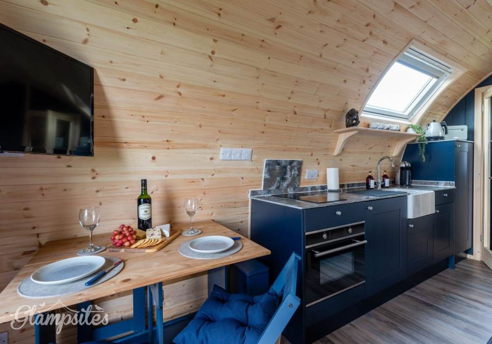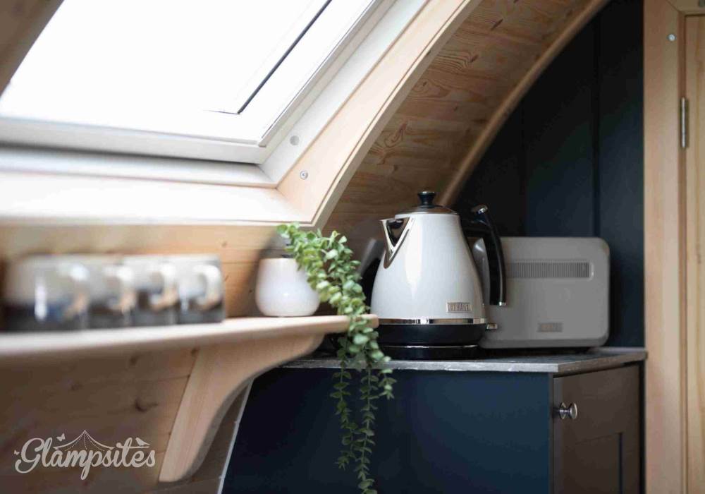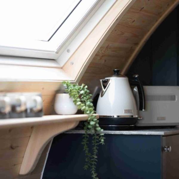 Our comfortable and stylish Willow Pod can accommodate up to 4 people and includes a King size bed and a pull-out sofa bed with bedding stowed away (when booked for more than 2). Other features of your stay include an en-suite shower room with a heated towel rail, double-glazed VELUX windows and blinds, a flat screen smart TV and a fully-equipped kitchenette including a microwave combi oven, fridge freezer, toaster, kettle and induction hob.