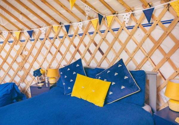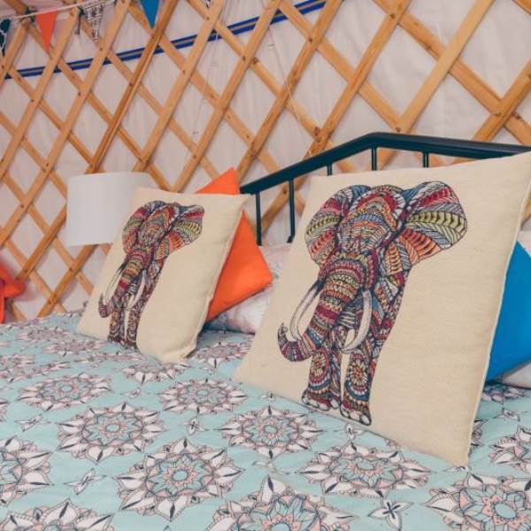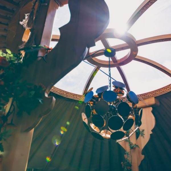 Krug, our decadent Moroccan themed yurt, comes complete with a comfy double bed with all bed linen, including warm throws and soft cushions plus 2 double futon company single beds, with thick toppers, making it suitable for a romantic break for 2 or a family/group break for 6. Of an evening turn on the star projector and enjoy the stars of the galaxy above your head.