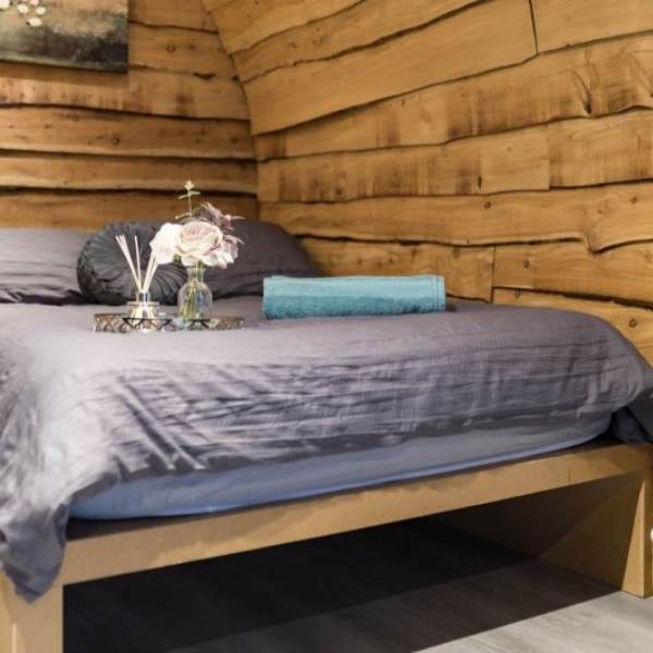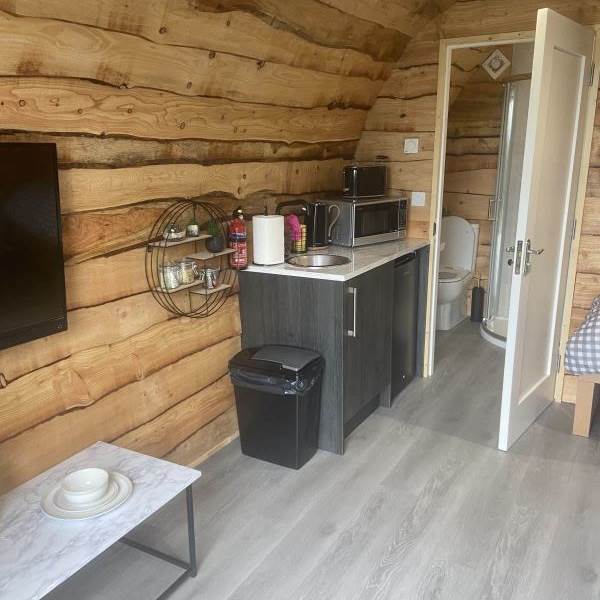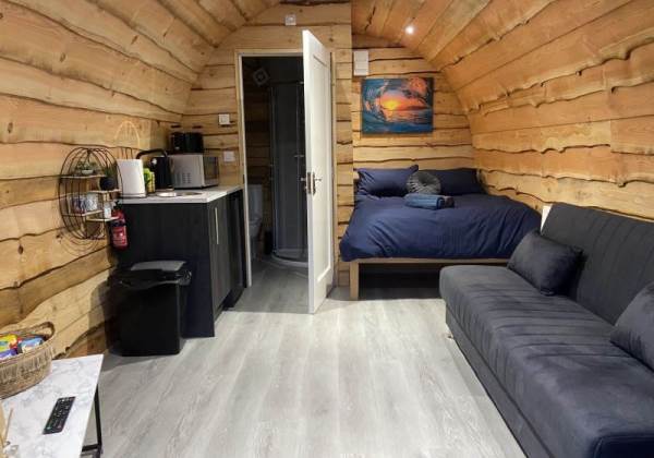 Our Suffolk Glamping pod boasts a full sized room, fully protected with our solid roof. Complete with double bed, large sofa bed, luxury linen, modern furniture, heating and electricity. Your en-suite bathroom has a toilet, sink and shower. Our bathroom suites have been built and completely designed by us here in Hilltown Co. Down.