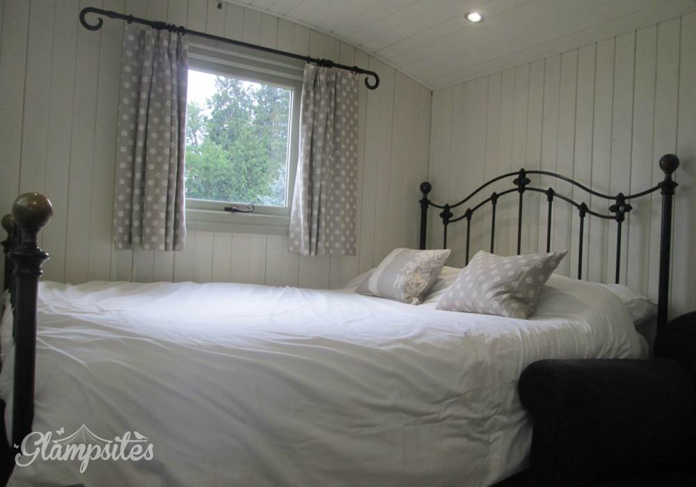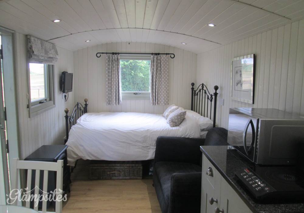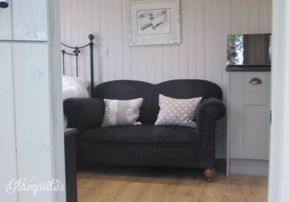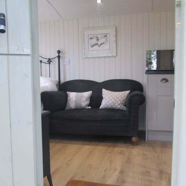The Shepherds Hut comprises a double bed, two seater sofa, seating area, kitchen area with belfast sink, microwave/grill oven combi, small fridge, plug in induction hob/pans, kettle and toaster.