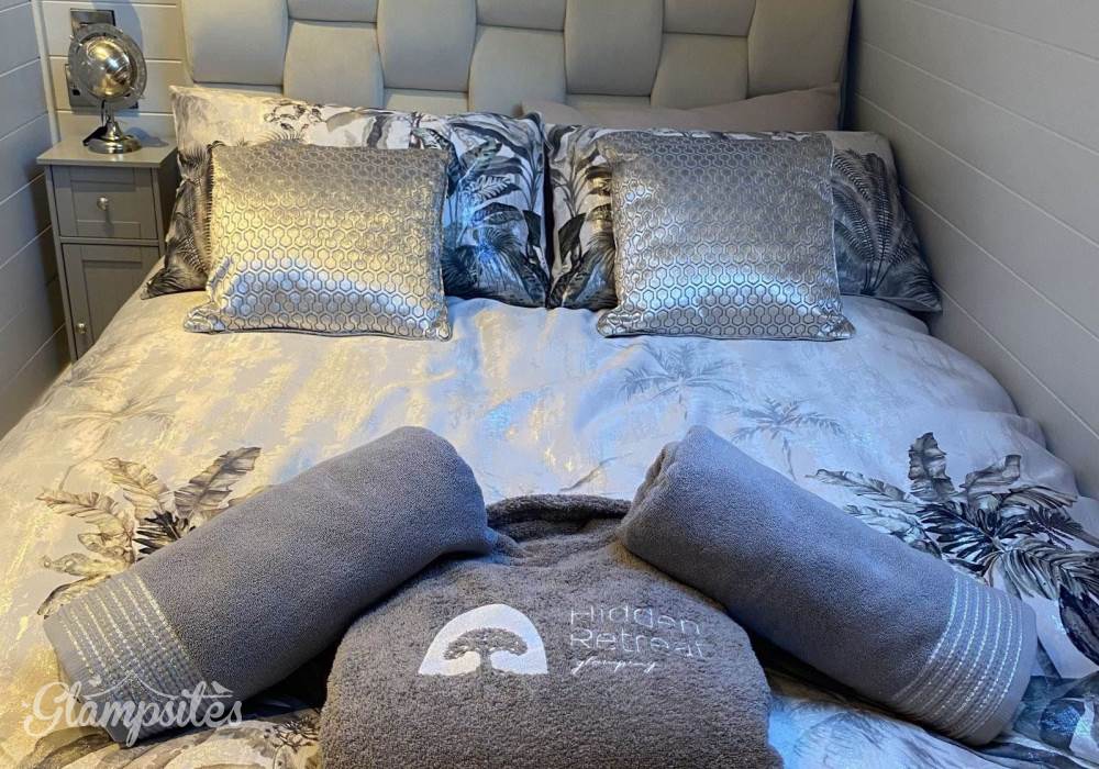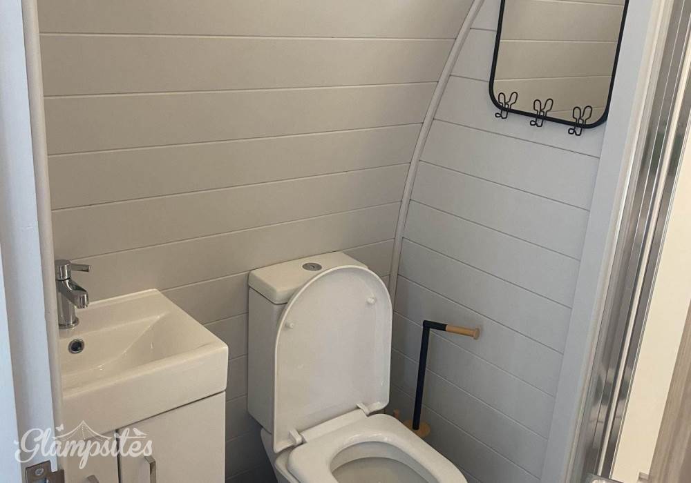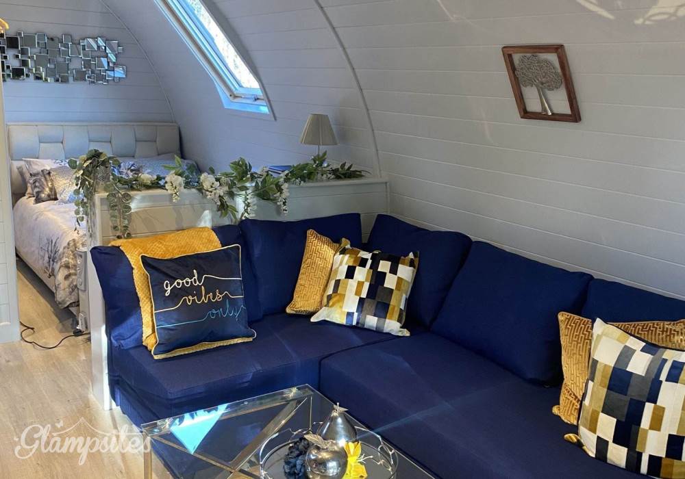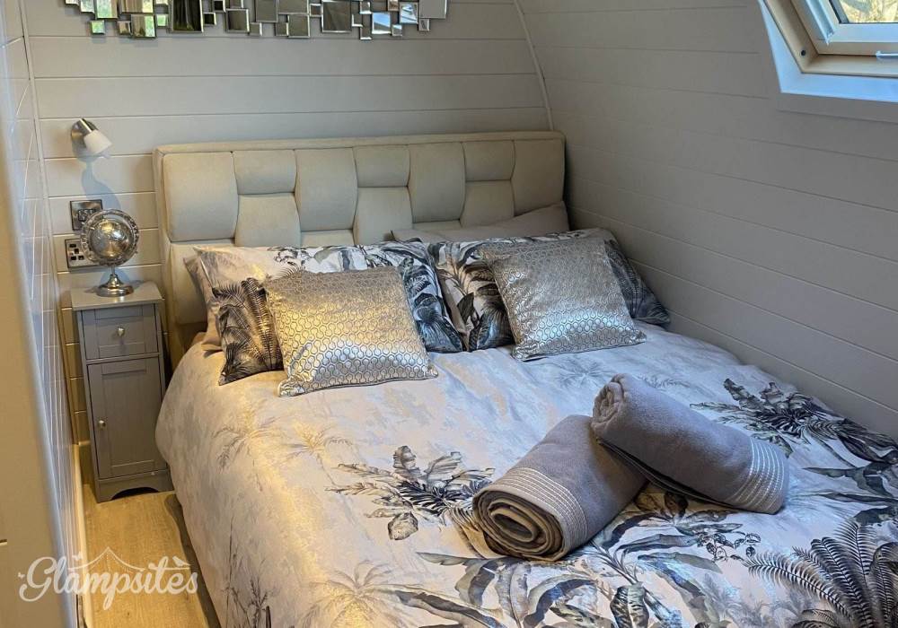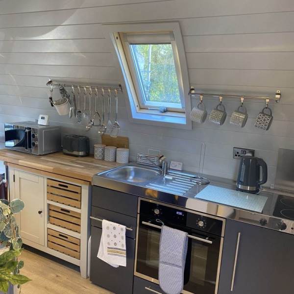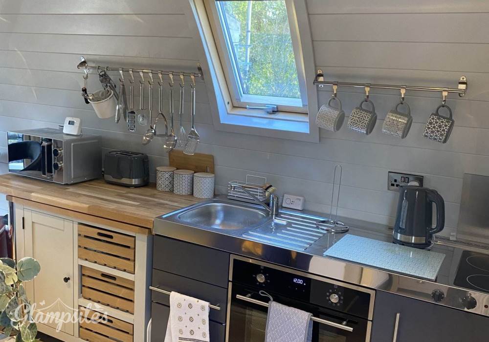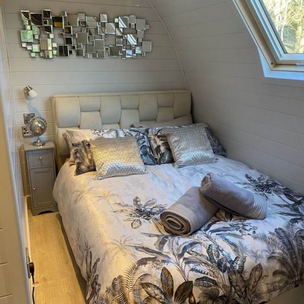 Subtle grey walls coupled with the soft hotel furnishings sets the tone for an intimate feel of a luxury boutique hotel inside this pod. With everything you need on tap; from one double bedroom with a bathroom featuring a shower, toilet and wash basin, an open plan living area with a sofa bed which transforms into a comfy double bed, perfect for the kids or another couple and a small kitchen area equipped with a fridge, cooker, hob and sink, the Oley is definitely the definition of luxury glamping!