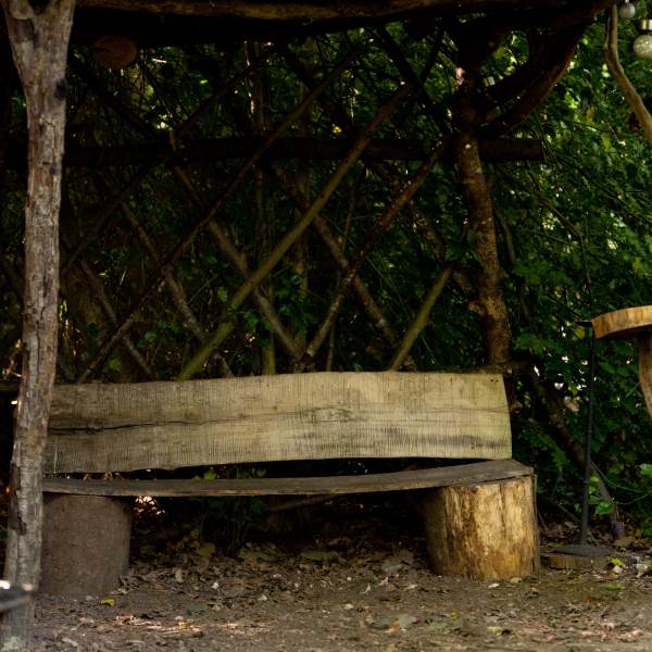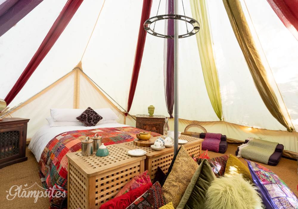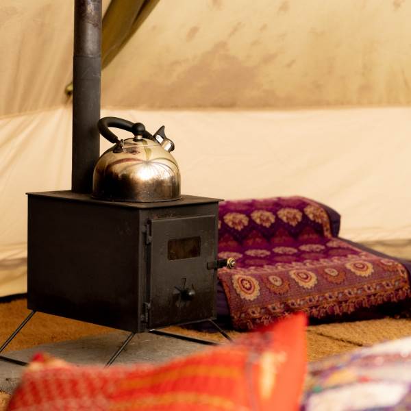 The tents sleep 2 adults and up to 4 children. The Bedouin Bell Tent sits to the side of the main clearing where the pods are situated, in it's own private clearing looking out into the beautiful woodland. Everything you need for a self catering stay is included ie: all cooking eating and washing up equipment, towels, bedding and of course private bathrooms right next door with hot shower and flushing loos. Each unit has it's own under cover cooking area with gas stove, charcoal BBQ and private seating area. The tents are off grid so have log burning stoves, whistling kettle, cool box and communal fridge shared between the 3 tents . Whilst we provide everything you need for a lovely comfy glamping stay, we stay true to the camping vibe by drawing our guests outside to sit around their firepits, under cover area, outside cooking area, bathrooms next door to your accommodation and fun z beds for the children to pull out and make themselves of course the adults get a comfy double! Everything on site is drinking water, no need to bring bottled water!