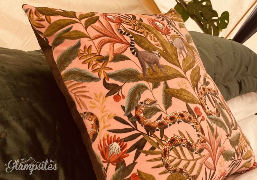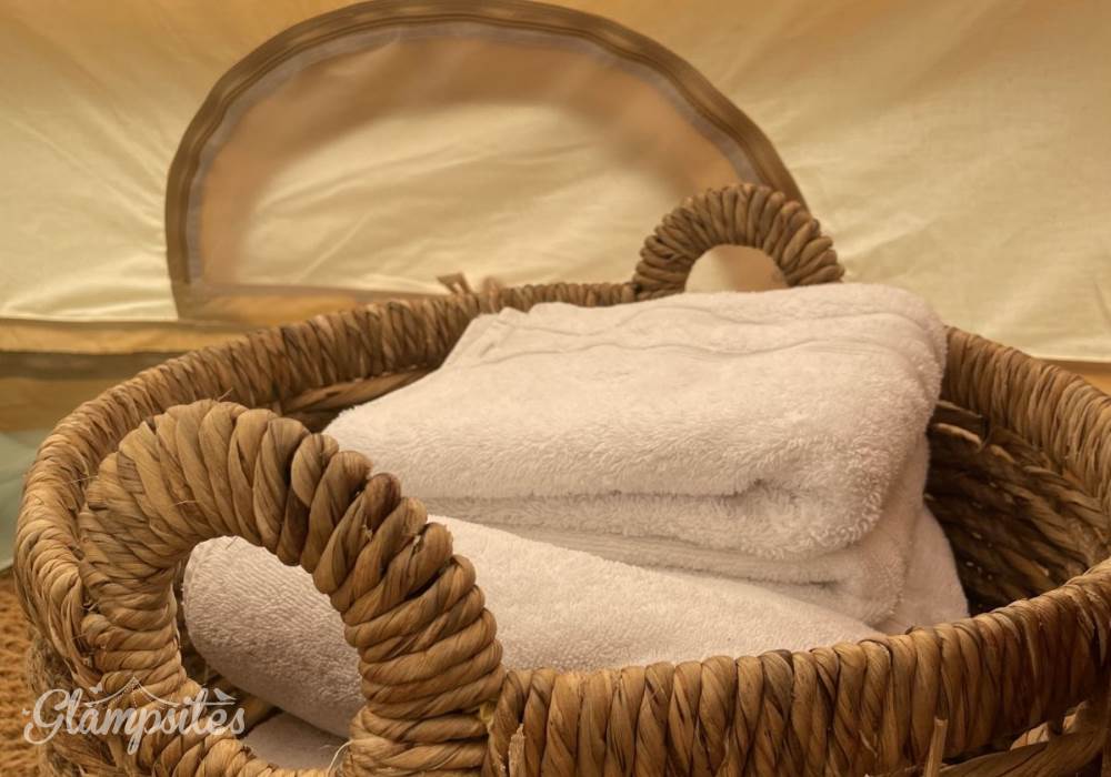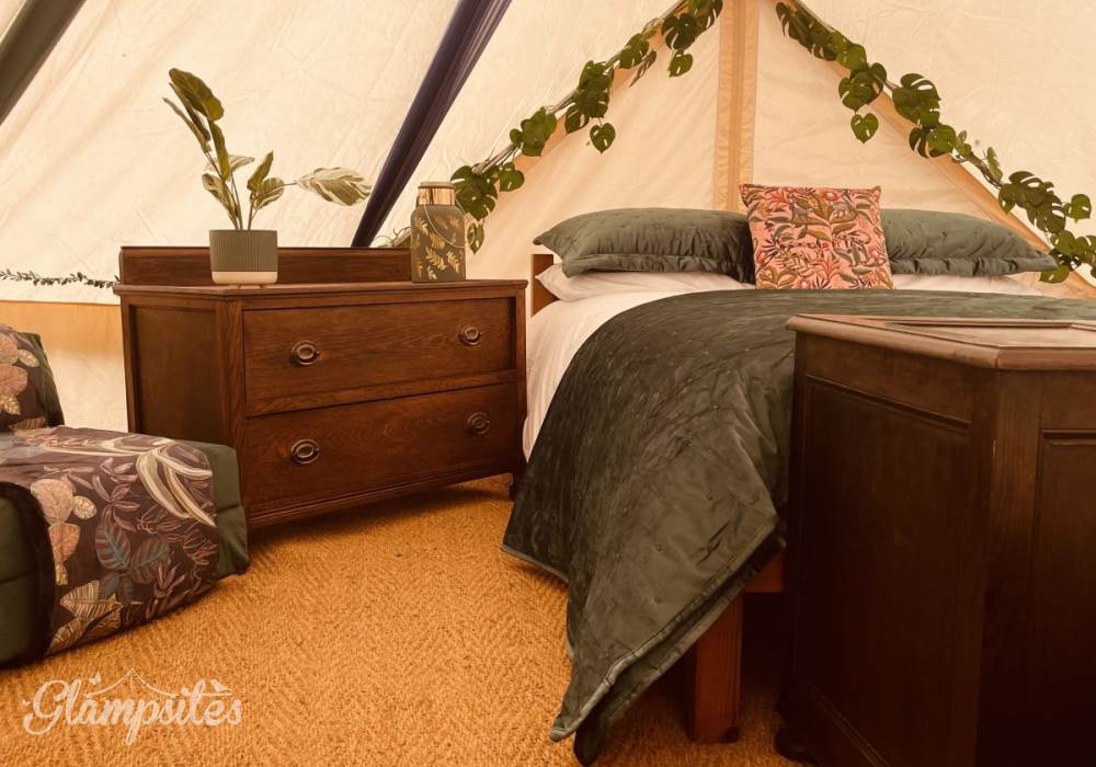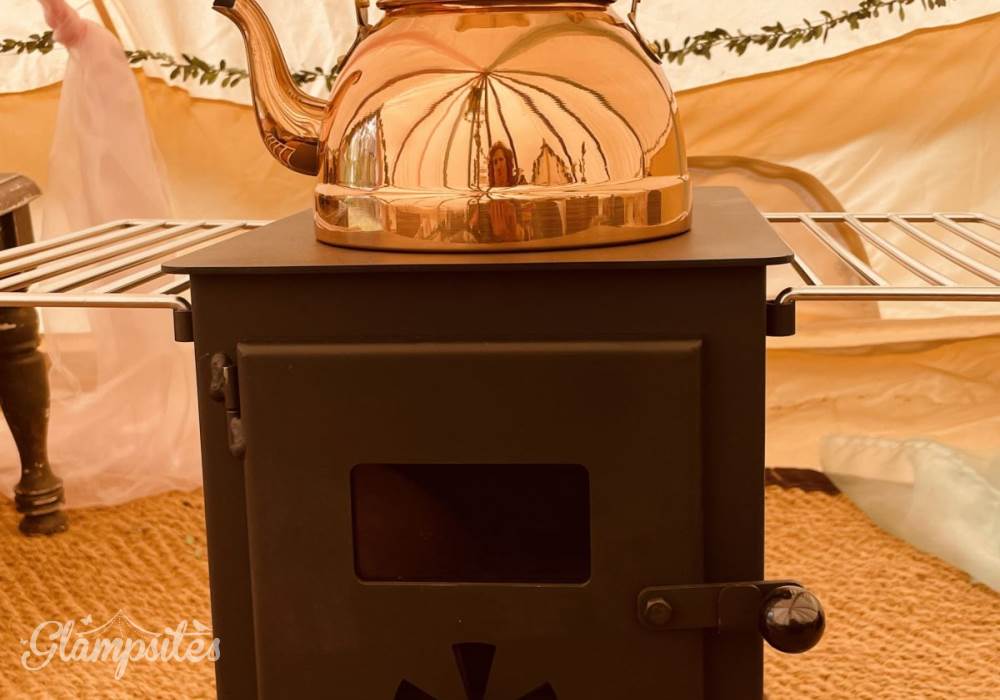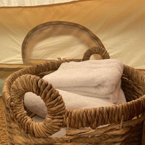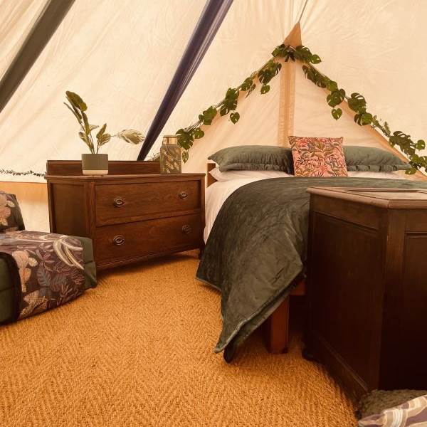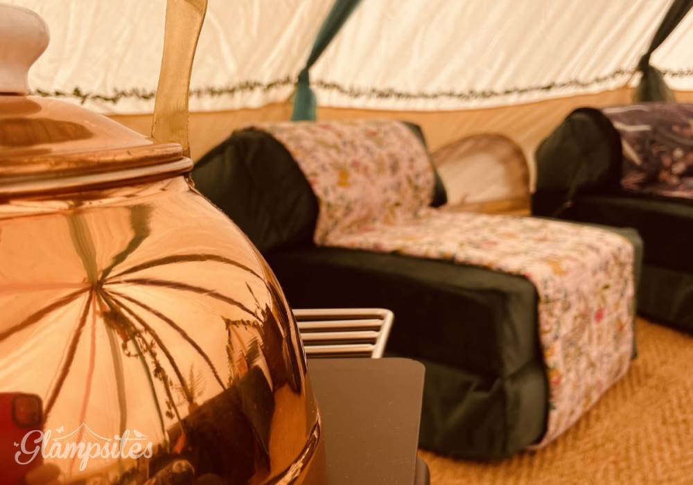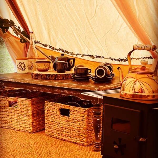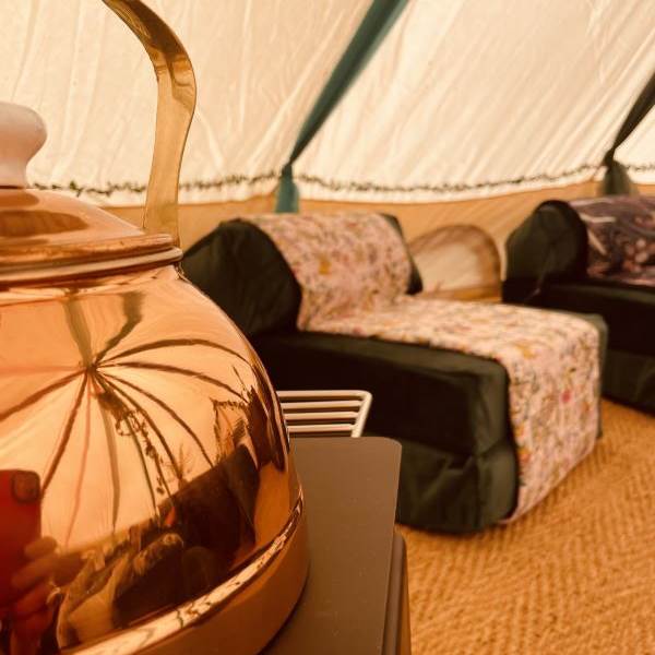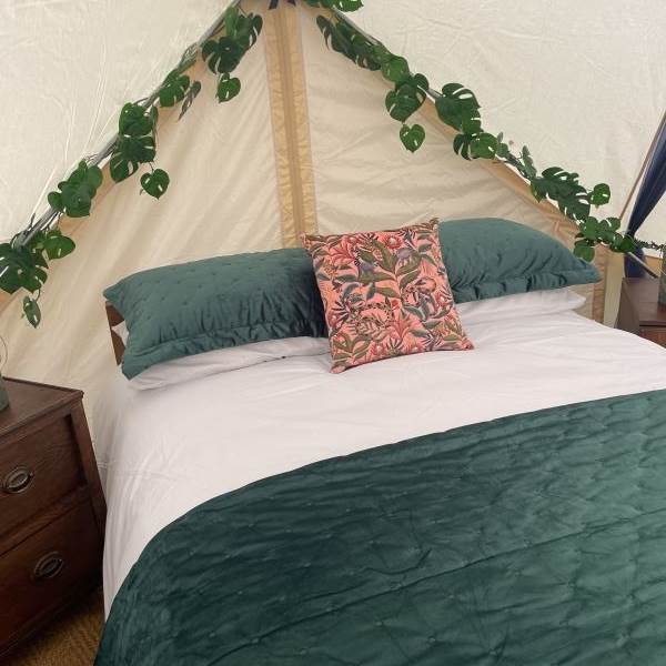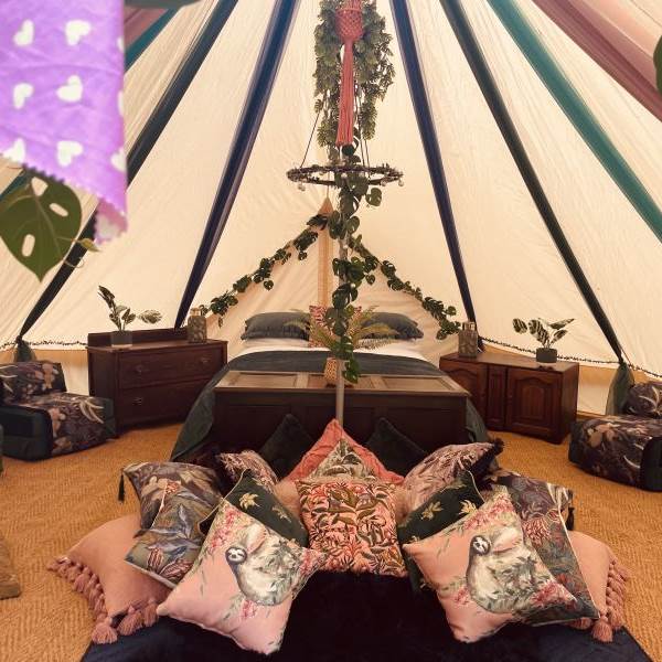 The tents sleep 2 adults and up to 4 children. The Jungle Bell Tent sits slightly further into the woodland, in it's own private sunny clearing looking out into the beautiful woodland, but still only 40 meters from the main clearing . Everything you need for a self catering stay is included, all cooking eating and washing up equipment, towels, bedding, private bathrooms approx 20 meters away with hot shower and flushing loos. Each unit has it's own under cover cooking area with gas stove, charcoal BBQ and private seating area. The tents are off grid so have log burning stoves, whistling kettle, cool box & communal fridge shared between the 3 tents . Whilst we provide everything you need for a lovely comfy glamping stay, we stay true to the camping vibe by drawing our guests outside to sit around their firepits, under cover area, outside cooking area, bathrooms next door to your accommodation and fun z beds for the children to pull out and make themselves, the adults get a comfy double! Everything on site is drinking water, no need to bring bottled water!
