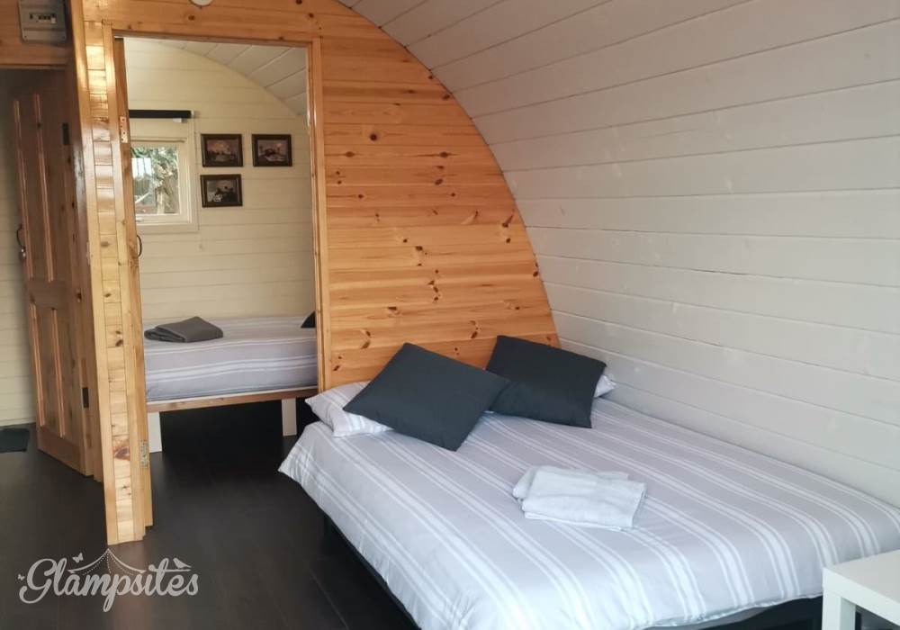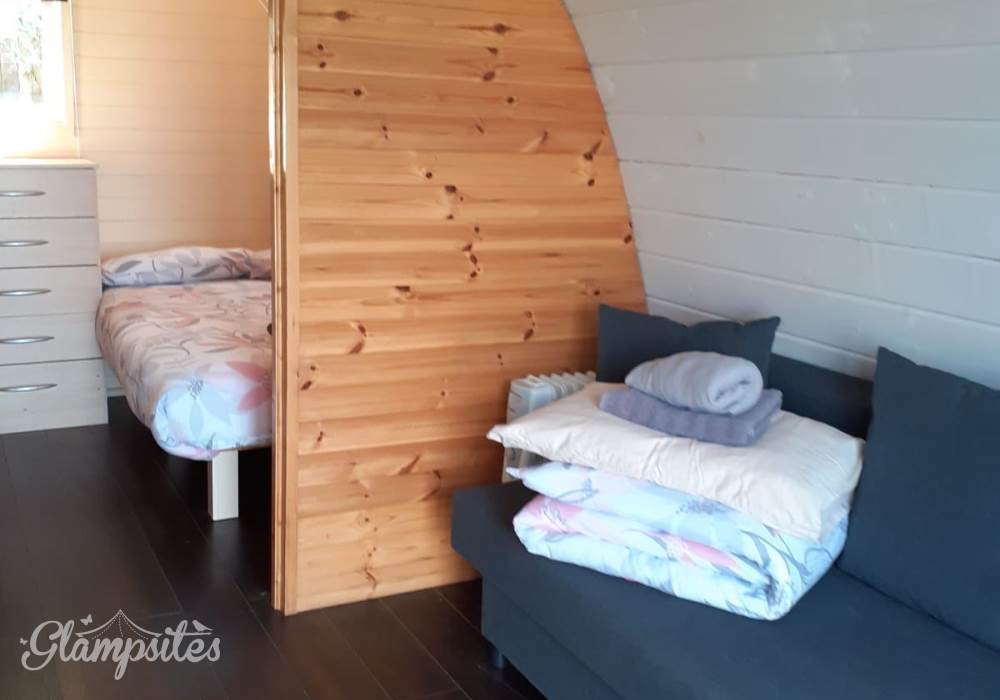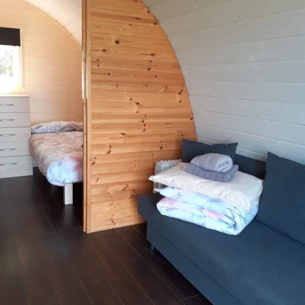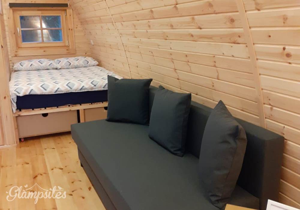 Each pod is cozy & fully furnished and accommodates up to 2 adults and 2 young children. The Pod is equipped with a double bed and lounge area with a double sofa bed.