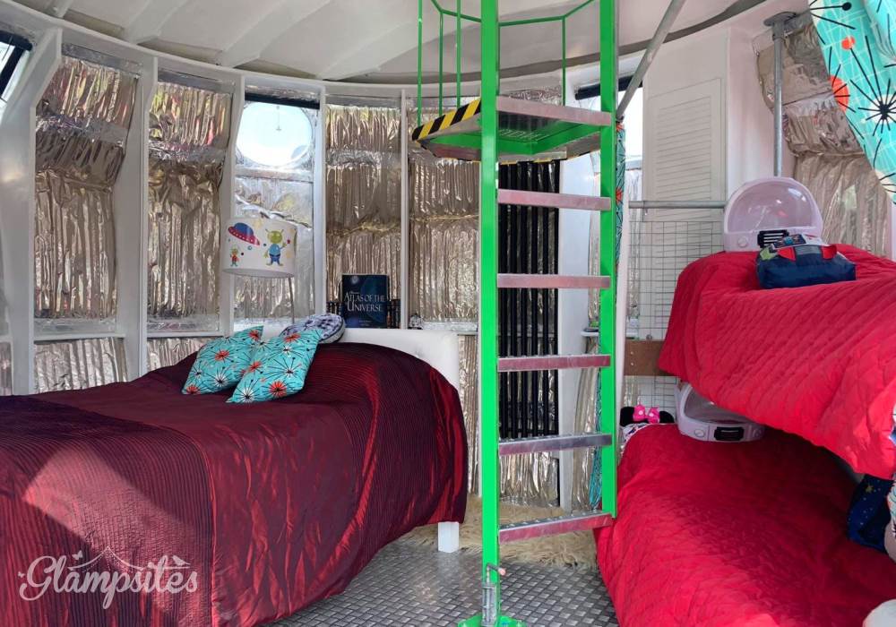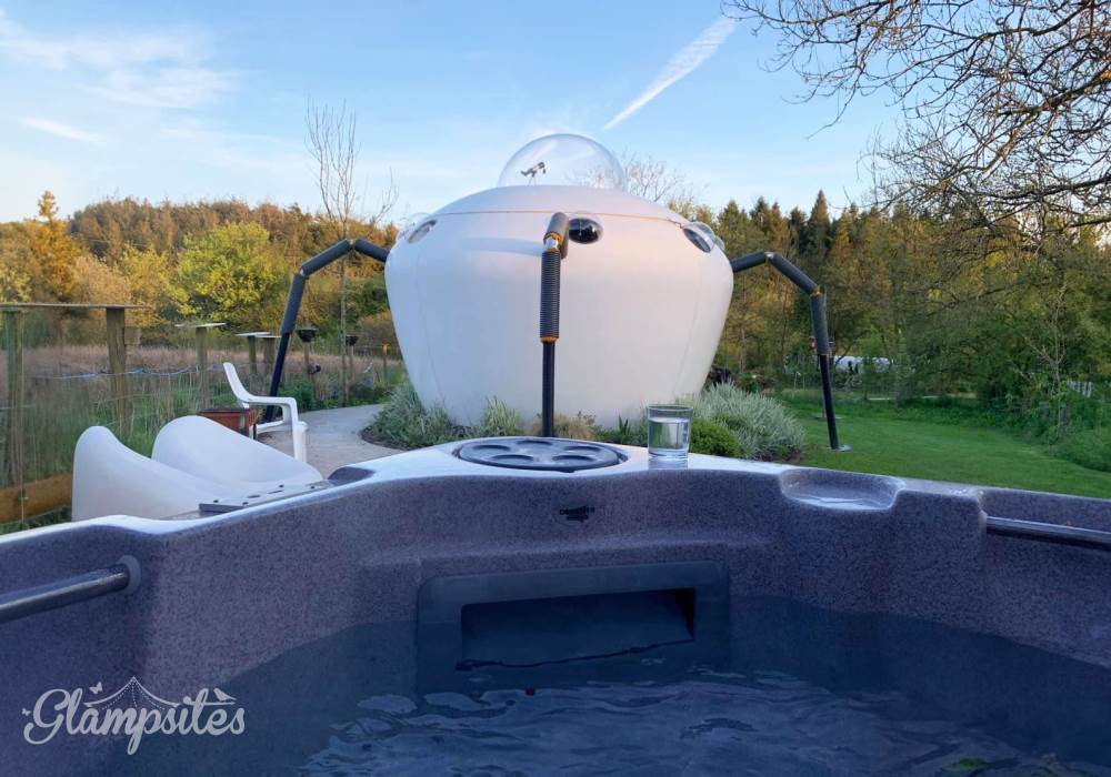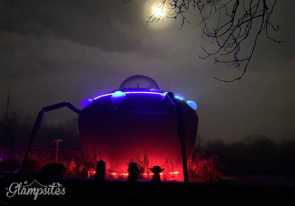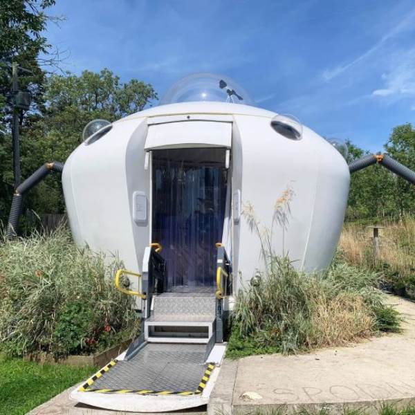 Nestled in the tranquil surroundings of Melin Mabes, the Spodnic UFO Pod offers a unique and quirky accommodation experience. This well-insulated, futuristic dome is designed to comfortably accommodate 2 adults and 2 children, providing a perfect blend of comfort and adventure.