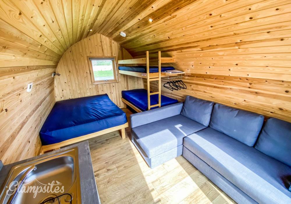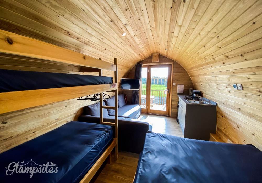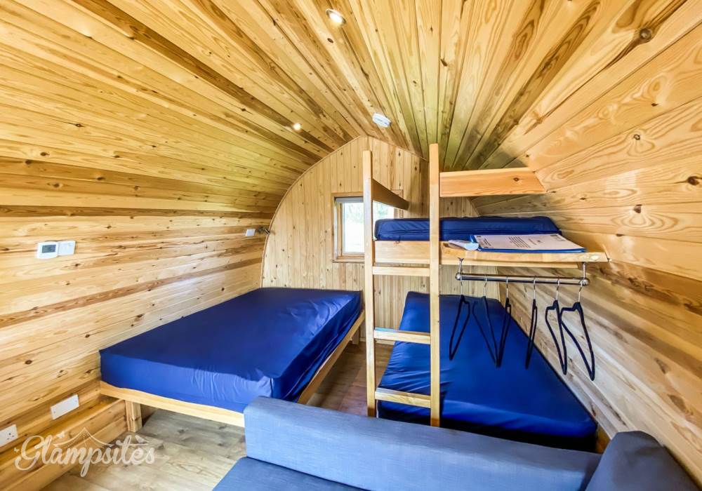 Our 6 berth pods sleep up to 6 adults with one double bed, one double sofa bed and two bunk beds. Please remember to pack any pillows or sleeping bags/duvets needed as well as bedding and towels as these are not provided in this glamping accommodation.