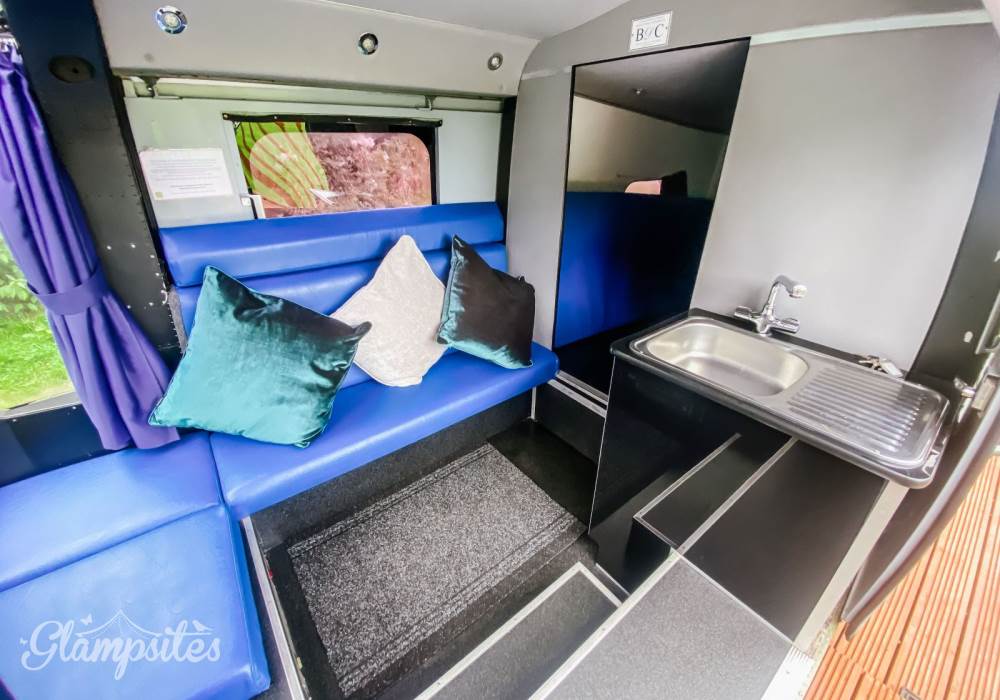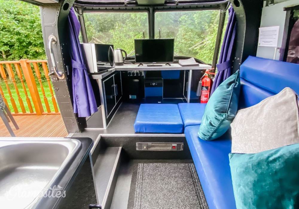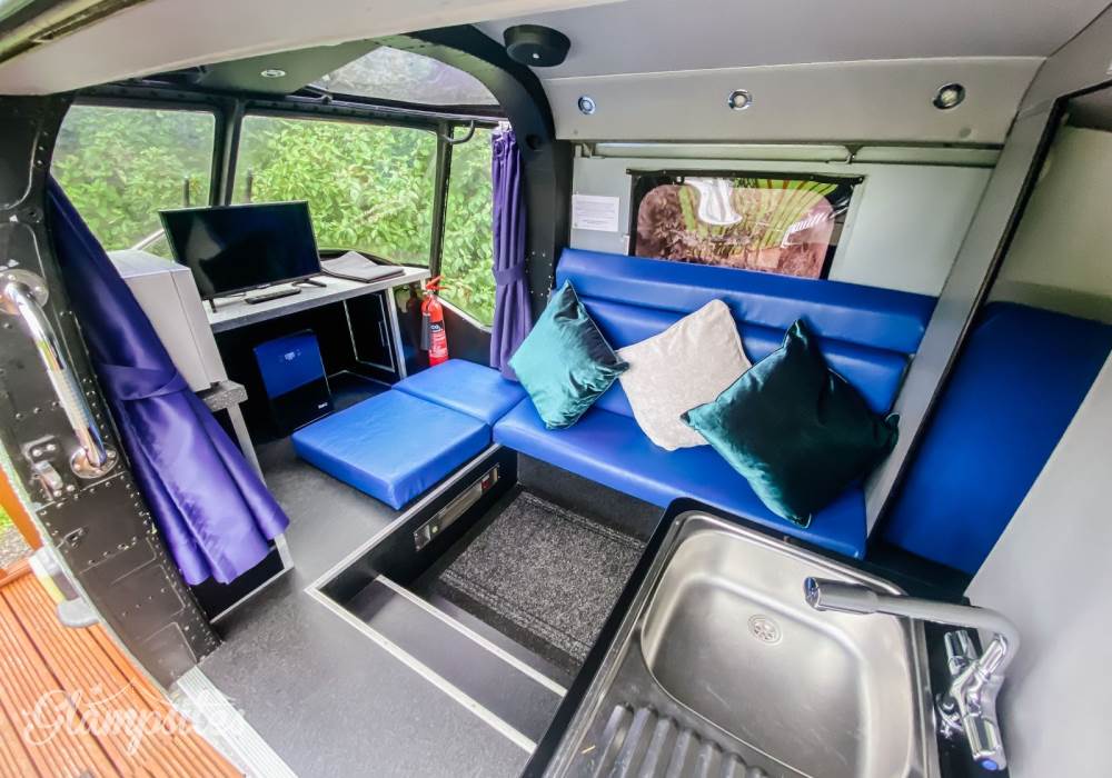 The Helicopter comfortably sleeps up to two adults and two children in a specially designed double ‘bunk’ at the rear tail, with a pull out sofa bed for the children in the main compartment. There is a small sink area with a kettle, microwave and mini fridge.