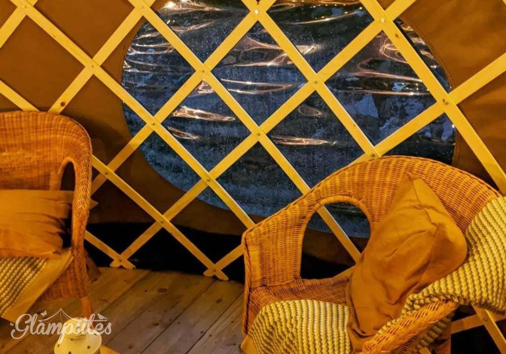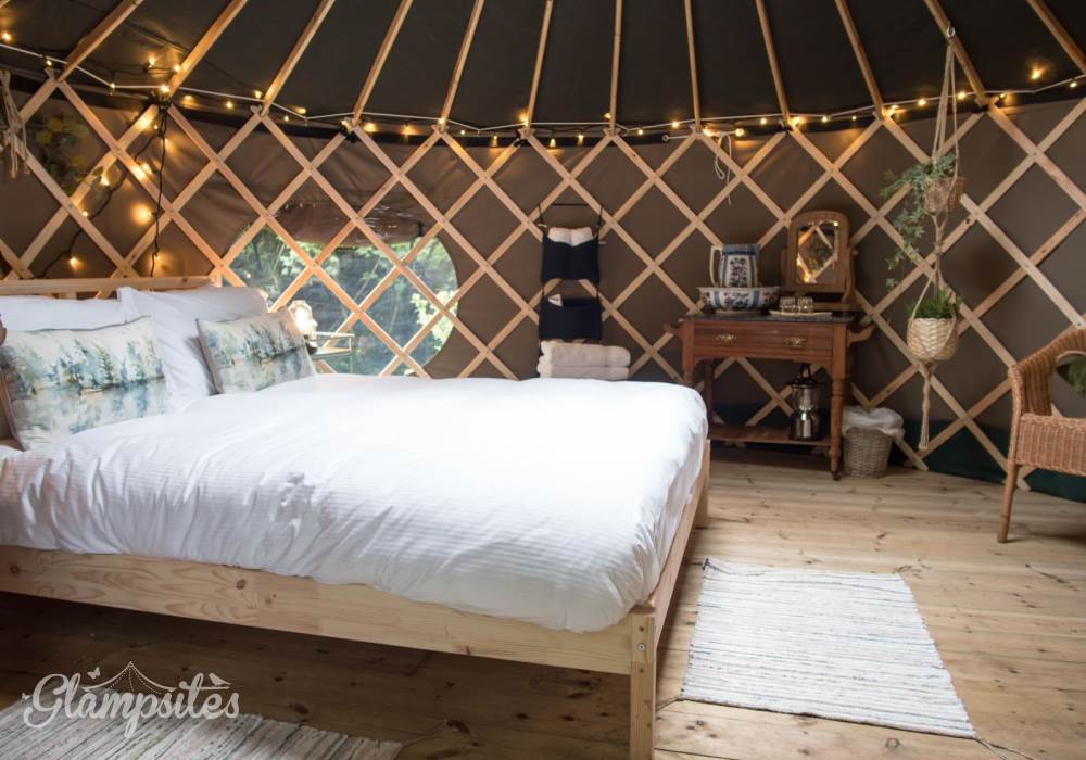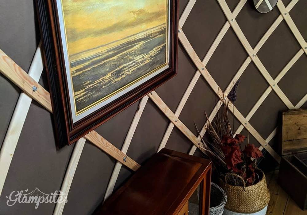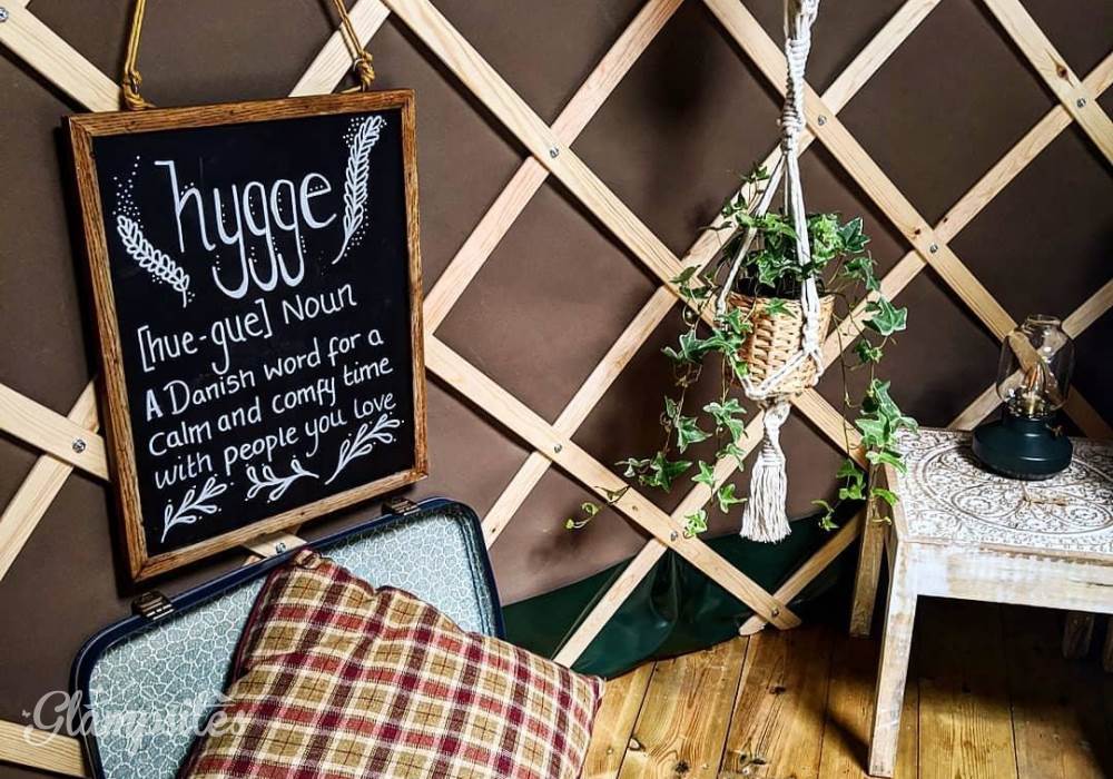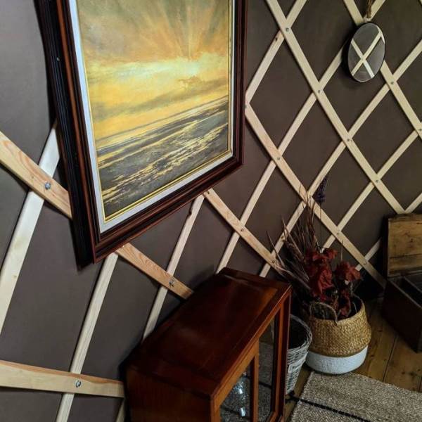 Yurt 18 (Hygge) is located over the bridge of Scandal Beck: sleeping 2 guests. Hygge (pronounced like Hugg-ar) is a Danish word meaning cosiness and contentment. The style is of low lighting, candles, lots of snugly rugs and plants for a relaxing atmosphere. Hygge yurt has 2 chairs, a king bed, a wash stand and 2 bedside tables to make this space feel like the inside out in this lovely space. With macramé and paintings by the Dinnes family (the owners of The Black Swan) inside it is the artiest yurt. It has a full size king bed and other normal size furniture for a inside out glamping experience without waking up with a sore back. Hygge yurt is dog friendly so feel free to bring along your furry family members. An extra charge will be added to your room of £15 for one dog/ £20 for 2 dogs as an extra cleaning fee and for some dog friendly goodies in the yurt with you such as poop bags and treats. We do not recommend having a z bed in this yurt as it's not built to have more than 2 people. Should you want extra family members or friends to join you, have a look at yurt 20 (Viking).