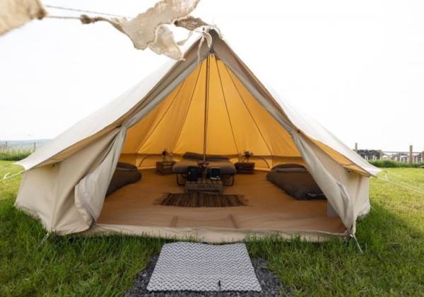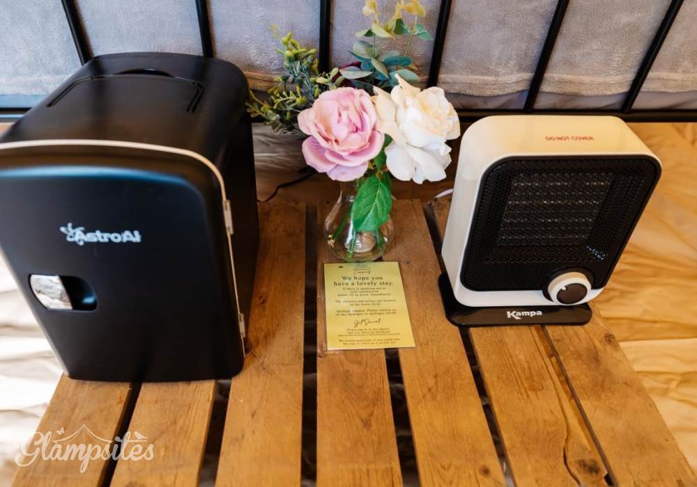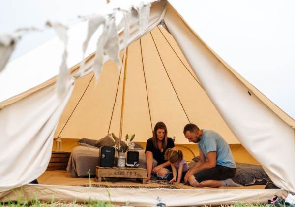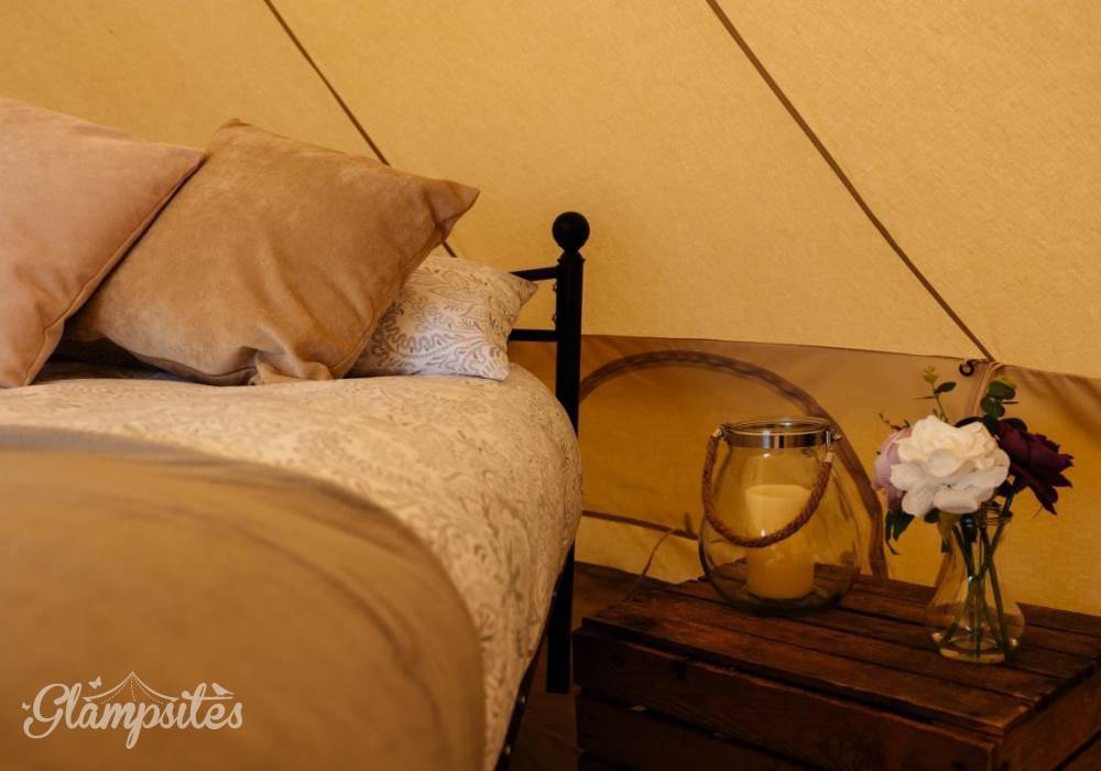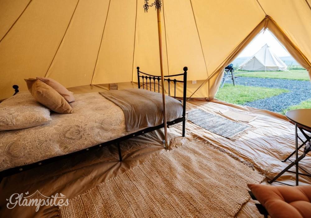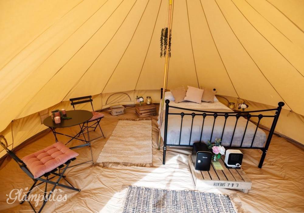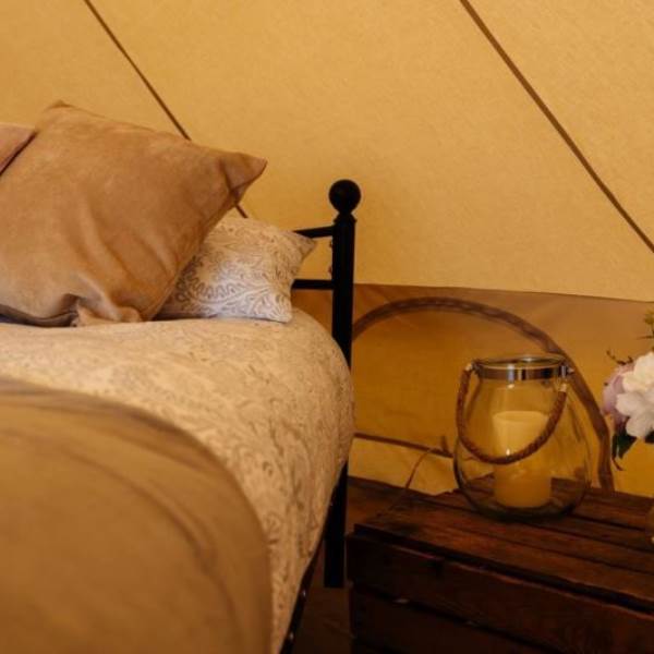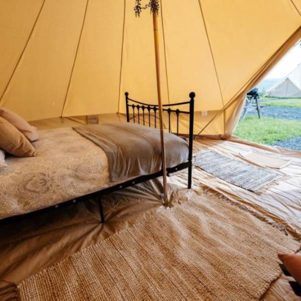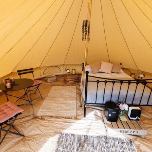 Sleeping up to 5 people our standard bell tents come with a Silentnight divan double bed and mattress, duvet, bedding (bed made), two pillows, blanket, mini fridge, heater, lamp, fairy lights and decorations.