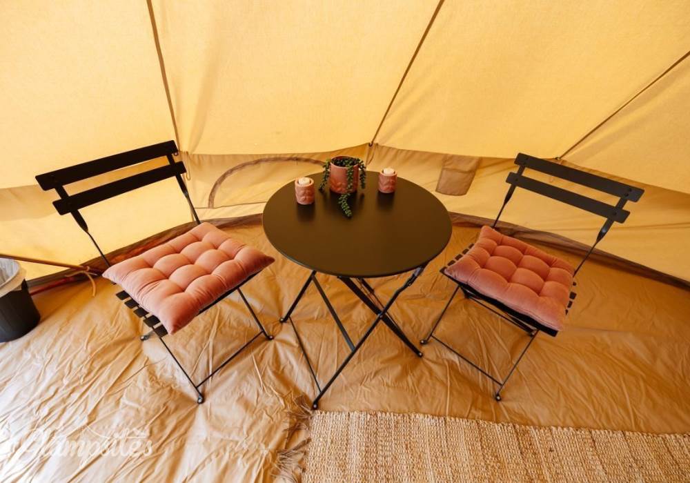 Our luxury bell tent accommodates up to 4 guests and includes all the above, plus an Alexa, luxury bedding, cushions, wooden base surround, deck chairs and a table and chairs for inside the bell tent. Please note the luxury bed is a metal bed frame.