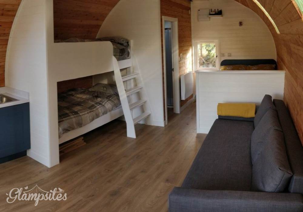 The Den is custom built with insulation, double glazing and electric heating, and is cosy all year round. Each pod sleeps up to 6 people in a double bed / bunk bed / pull out sofa bed but ideal for 2 adults and 2/3 children, or 4 adults,