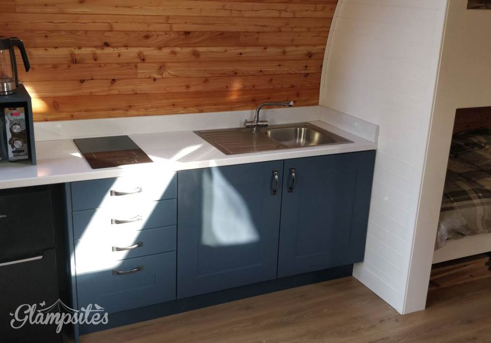 Inside each pod you will find a dining area with table and chairs/benches and a kitchen area equipped with sink, fridge, freezer, kettle, toaster and 2 zone hob. Pots, pans, cutlery and plates are all provided. There is an en-suite with shower, sink and toilet.