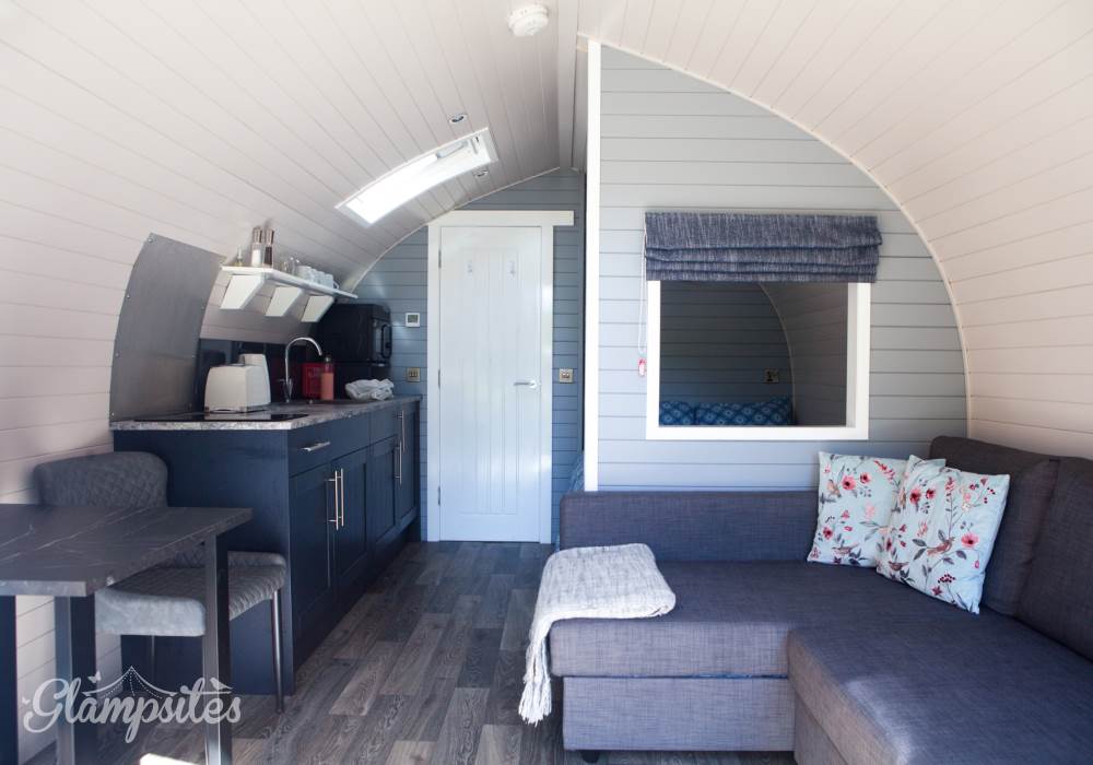 Step inside to discover a beautifully finished interior featuring a cosy double bed with a plush mattress and quality bedding. The pod is super-insulated and heated, ensuring a warm and inviting space all year round. A compact yet fully equipped kitchen includes a fridge/freezer, induction hob, microwave, sink, and dining table, while the en-suite bathroom offers a modern shower, toilet, and sink. For those visiting with friends or children, the pull-out sofa bed makes it possible to comfortably sleep up to four guests.