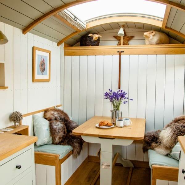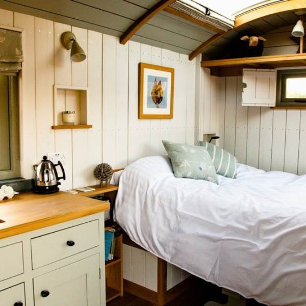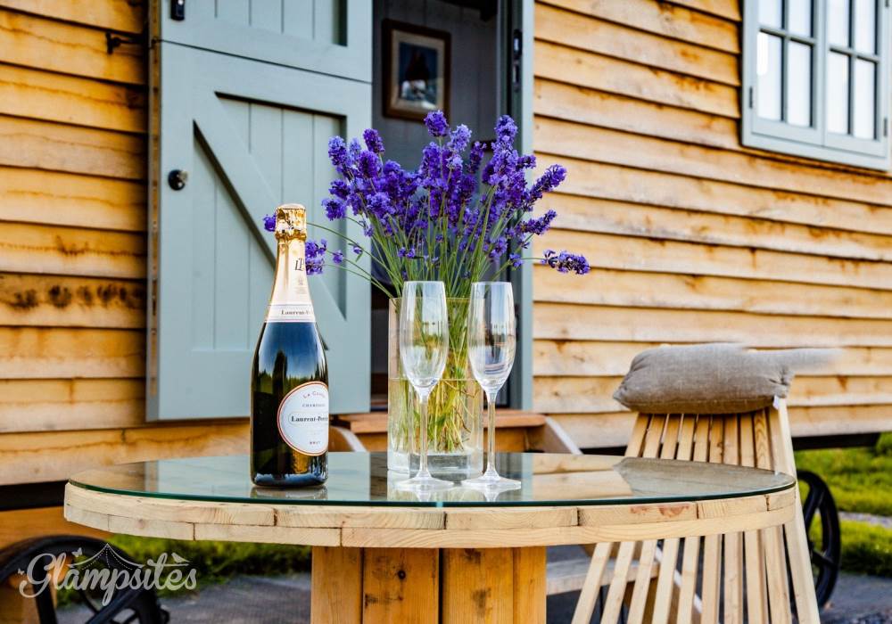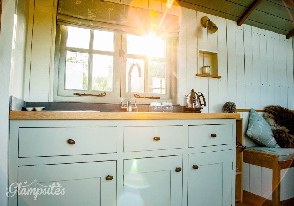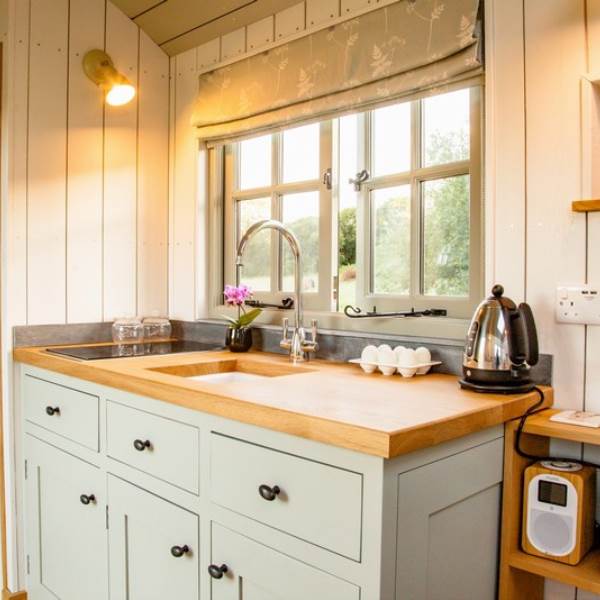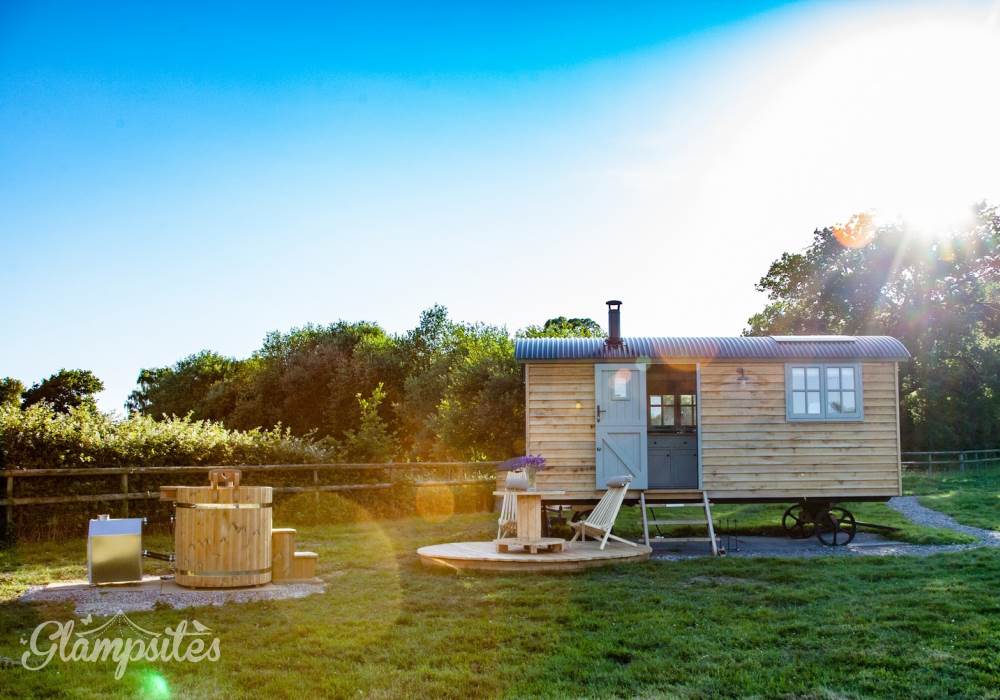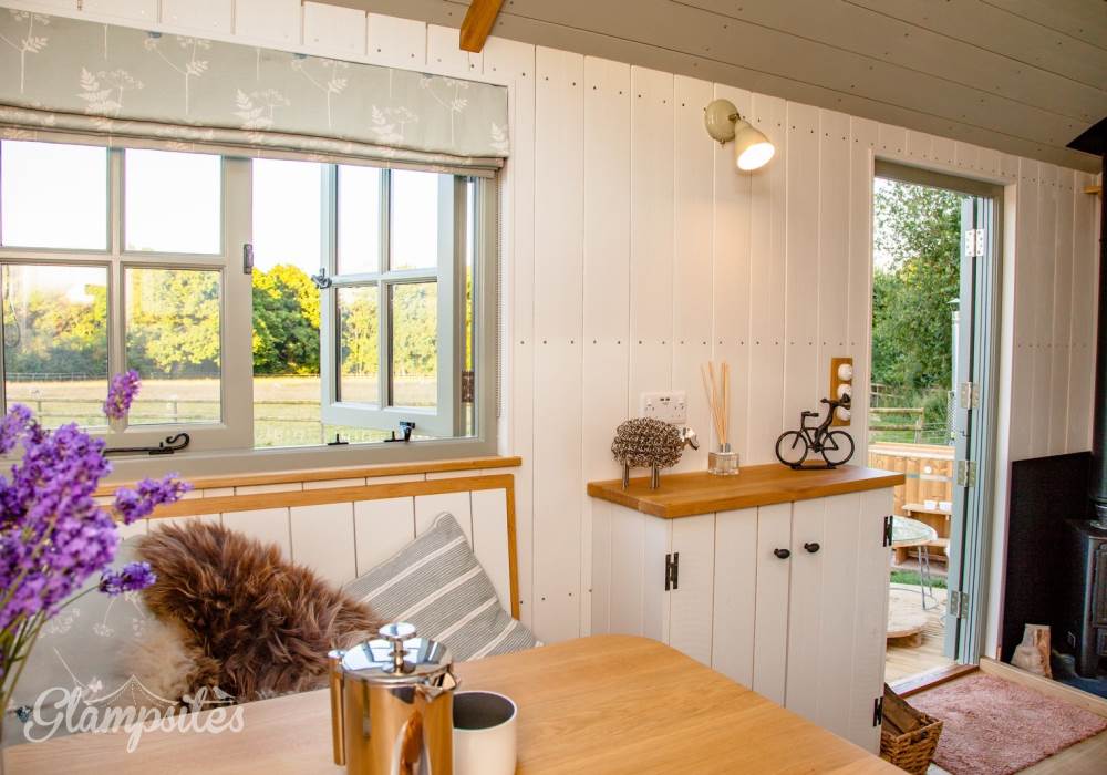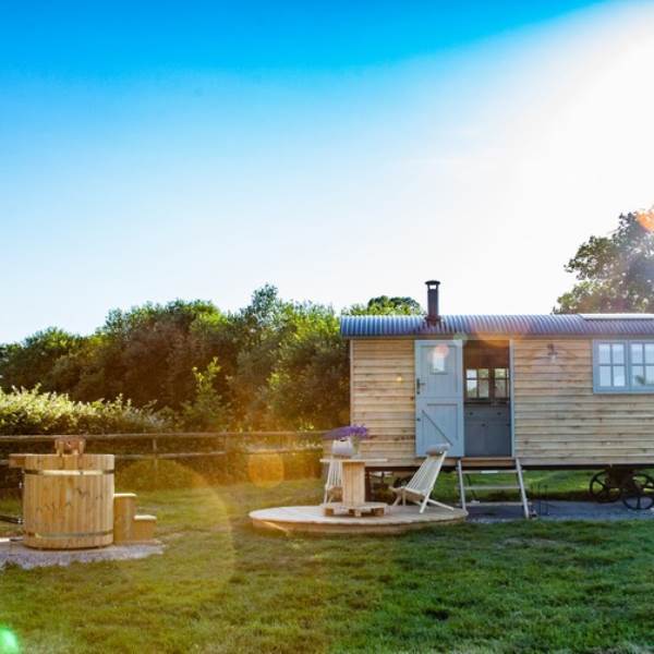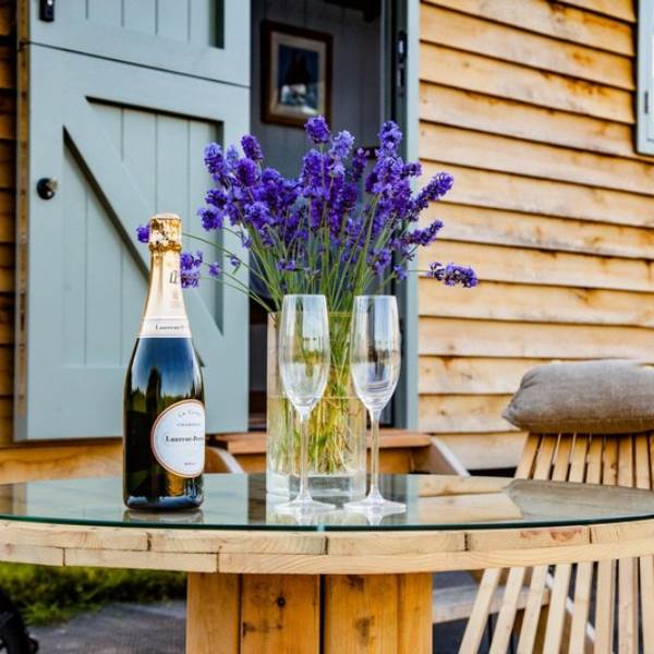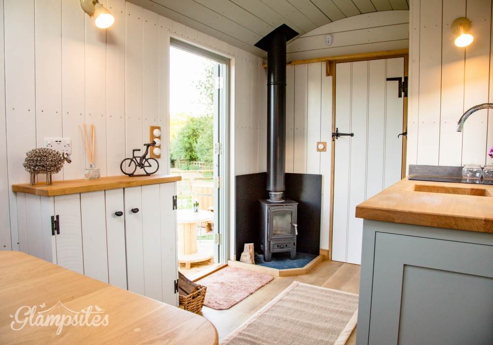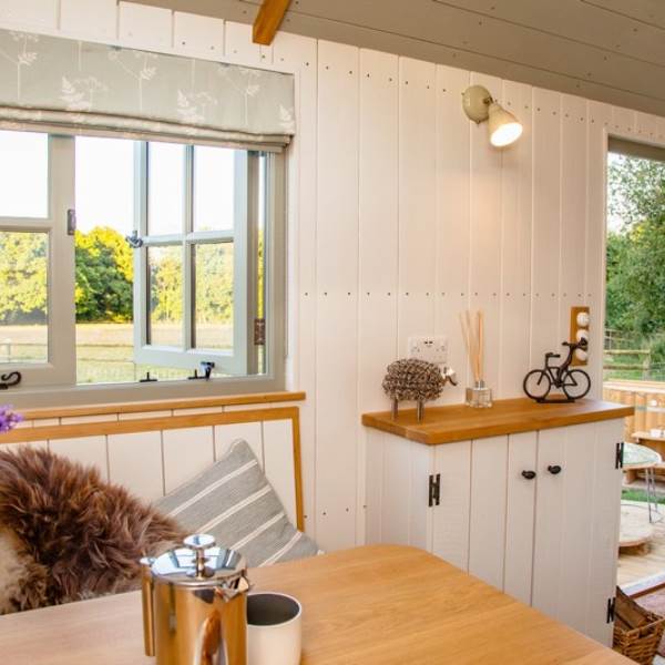 You will wind your way along a path 100 yards or so down to the Shepherds hut, a Victorian wooden wheelbarrow to assist you with your luggage. The Shepherds hut is situated in its own area surrounded by traditional chestnut wooden sheep hurdles. Next to the hut you will find a beautifully crafted Scandinavian fresh water wood fired hot tub, where you can relax and enjoy the sights and sounds of the wildlife whilst sipping a glass of Prosecco, or alternatively you can relax on the radial decking and enjoy alfresco dining with our fantastic Morso bbq/pizza oven. Or, swing your legs into the fabulous hammock - the ultimate way to chill!