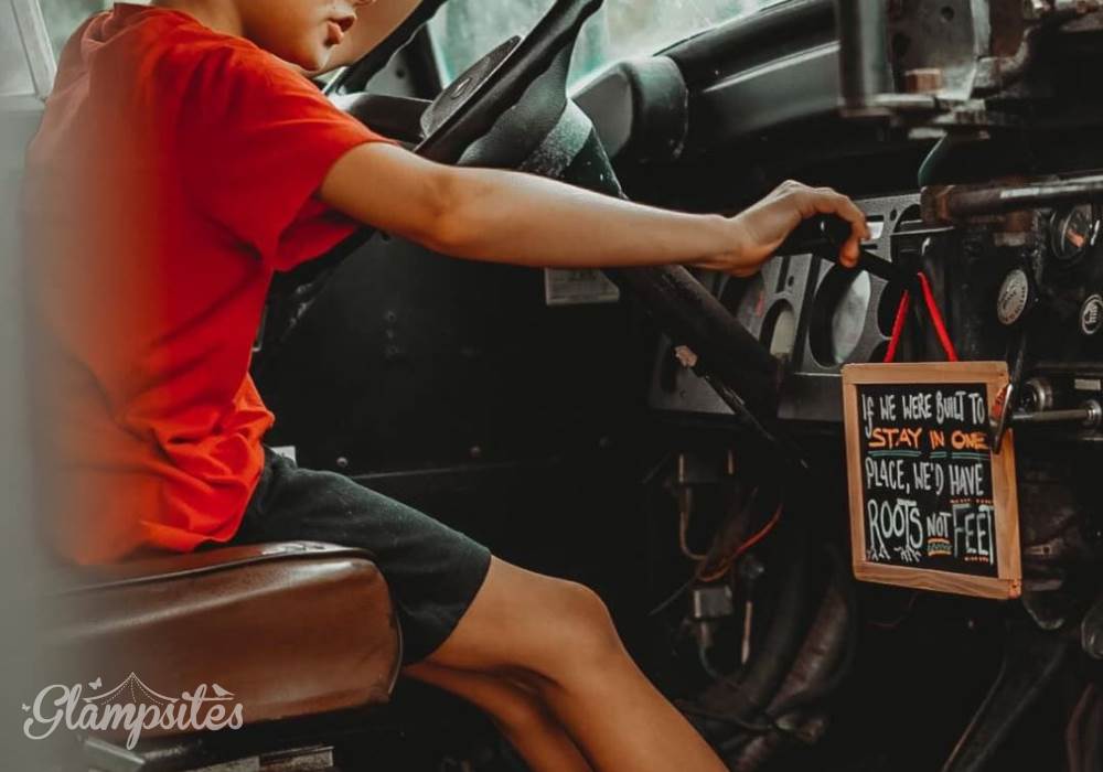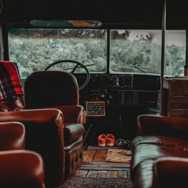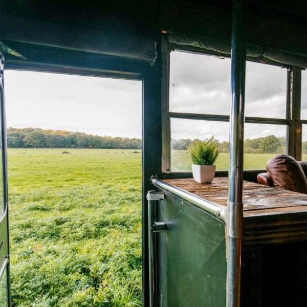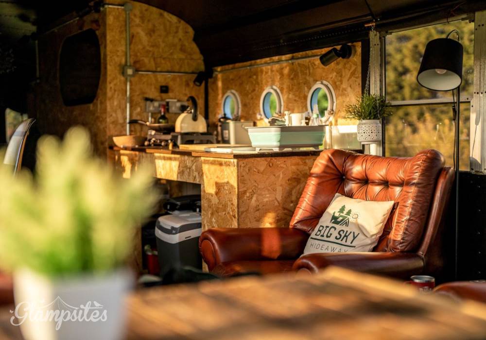 Inside the bus, unwind on comfy sofas and chairs, and feel at home in the well-equipped kitchen. The kitchen boasts a two-hob gas cooker, sink, breakfast bar, power points, and a heater for your convenience. The driver's seat is left intact, providing a quirky spot for selfies and feet-on-the-dashboard coffee pauses.
