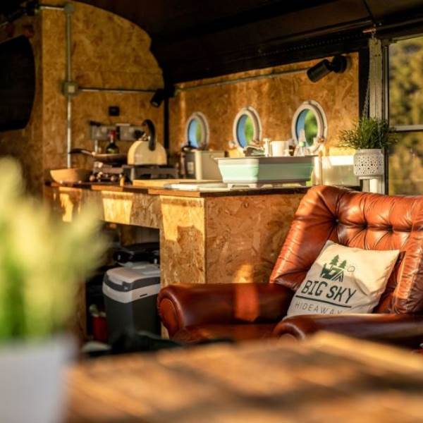 Escape to the serene beauty of Big Sky Hideaway and embark on a unique stay in our stationary American Schoolbus. Nestled in its private corner, this accommodation offers a perfect blend of nature and comfort. The Schoolbus, designed to sleep six, features an enormous super king bed at the rear and four snug single sleeping pods, ensuring a cozy night's sleep for all.