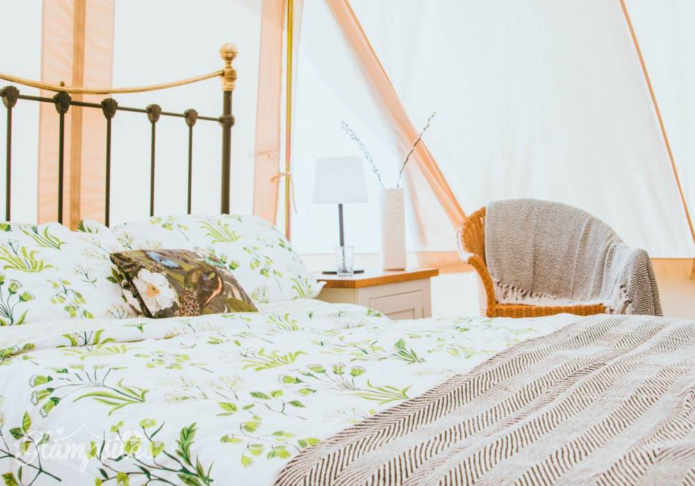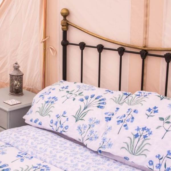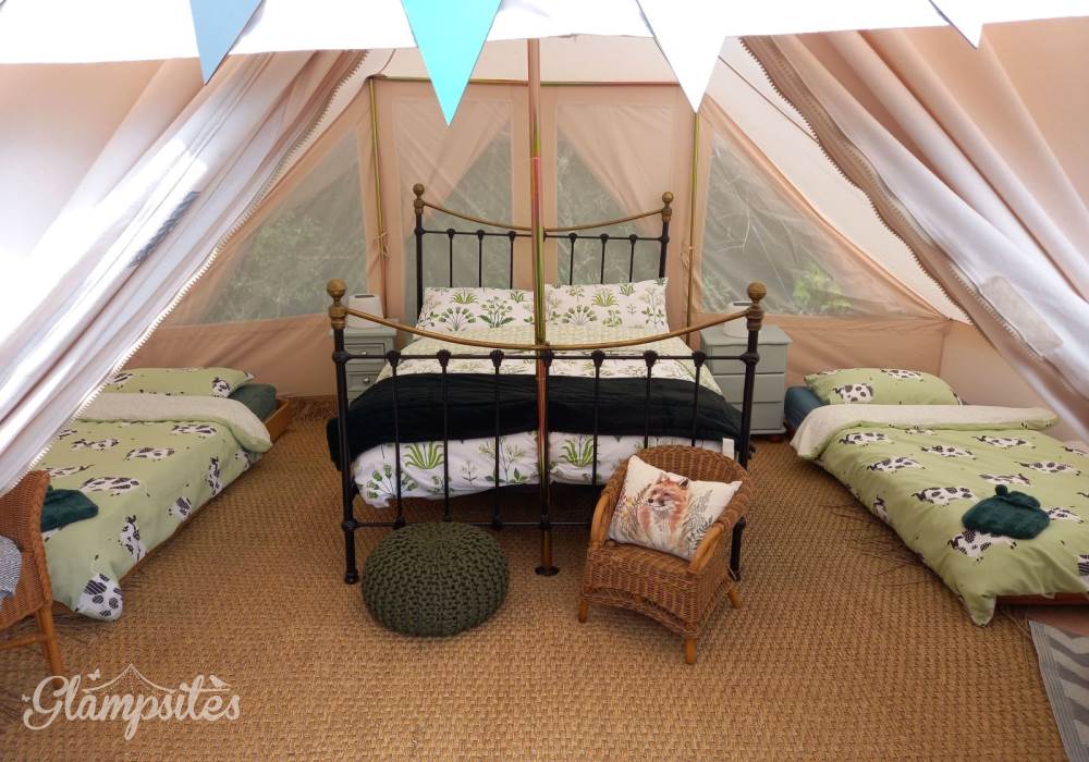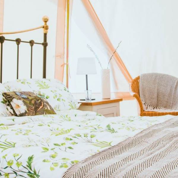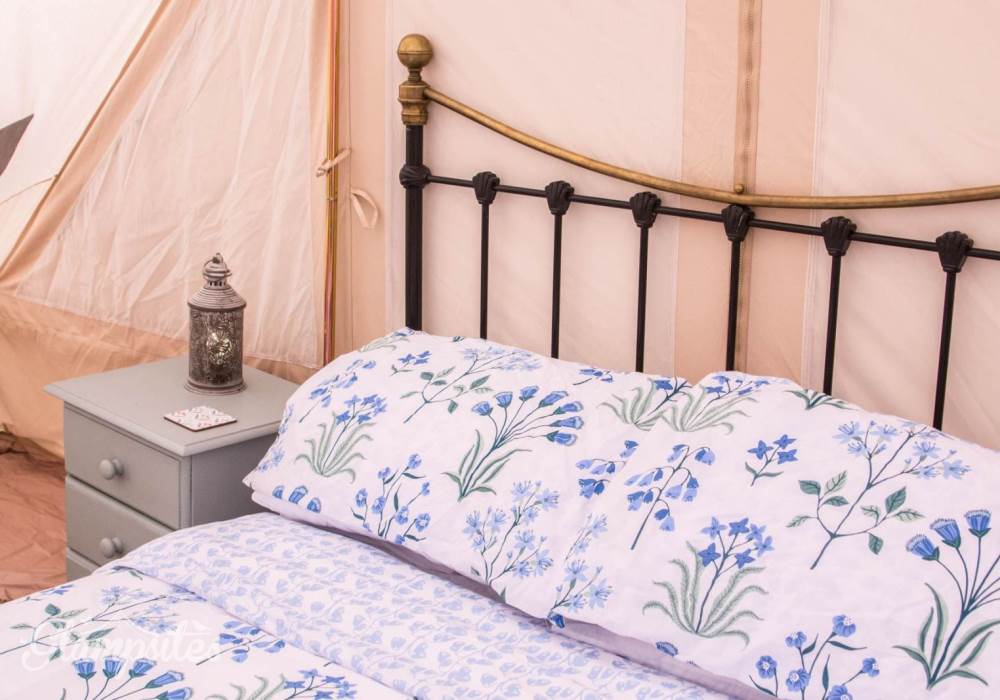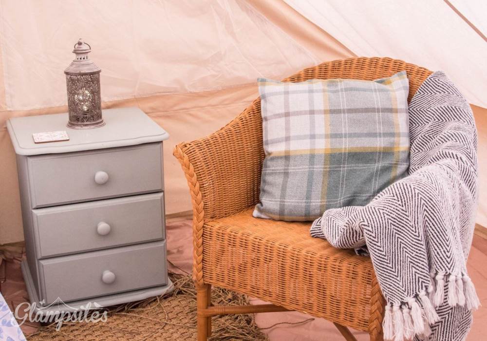 Mistletoe & Bluebell each sleep 4/5 persons, they are fully furnished with full-size double and single beds, bedside tables, a sideboard, wicker chairs, rugs and throws. You will find solar-powered lighting and a USB charger in your tent too.
