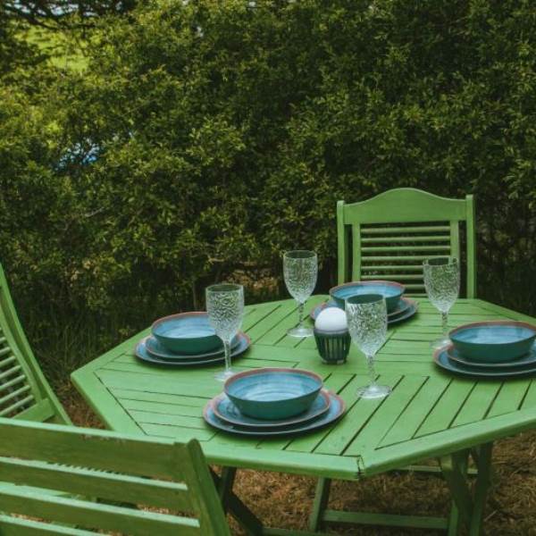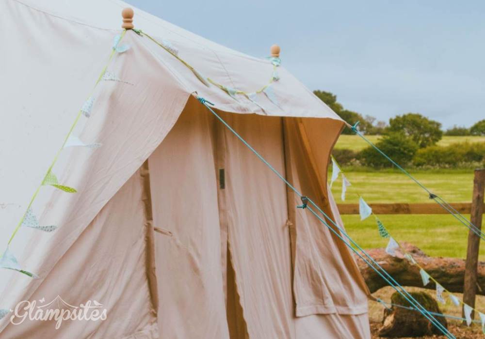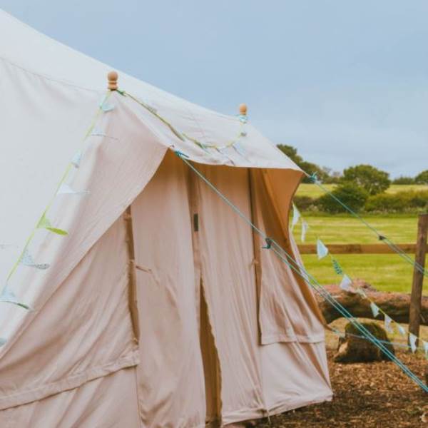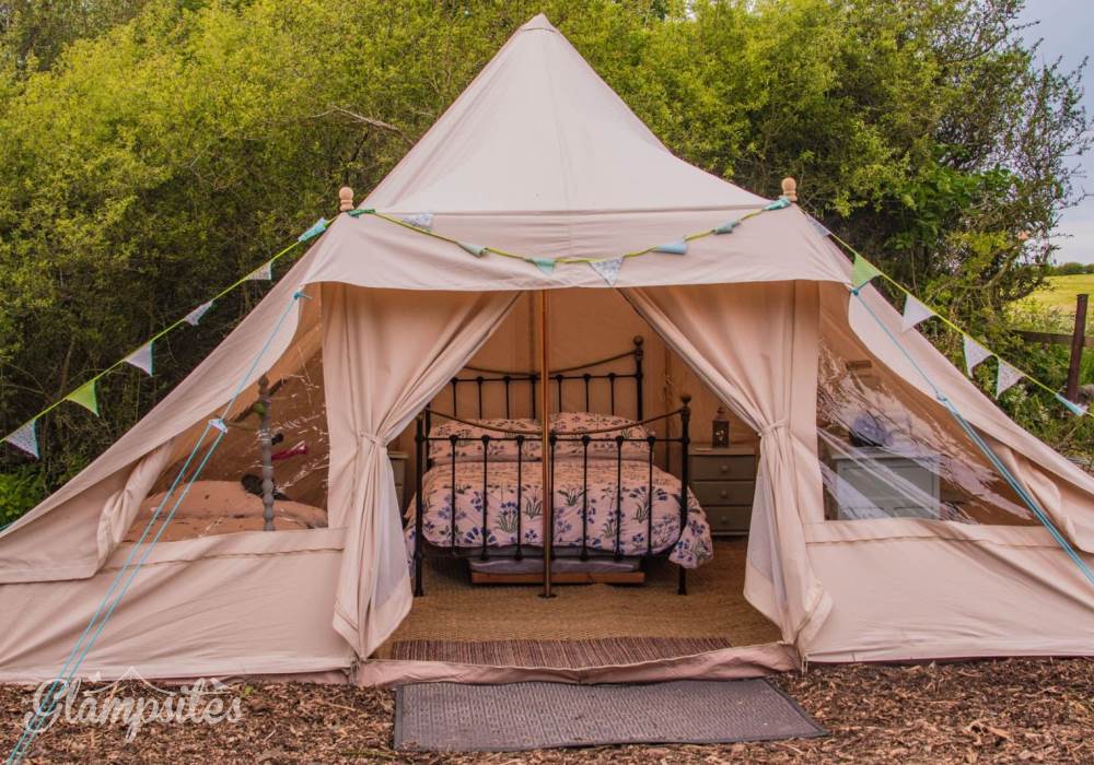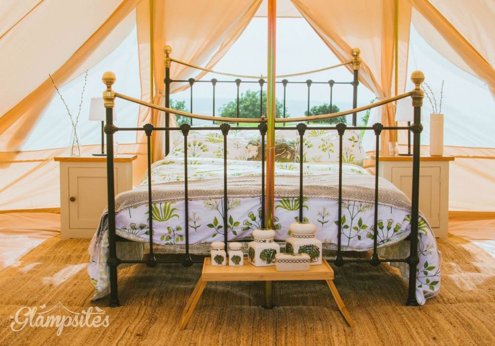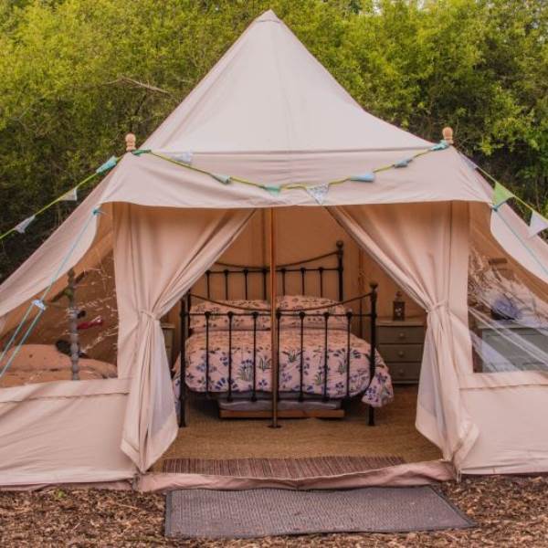 Mistletoe & Bluebell each sleep 4/5 persons, they are fully furnished with full-size double and single beds, bedside tables, a sideboard, wicker chairs, rugs and throws. You will find solar-powered lighting and a USB charger in your tent too.