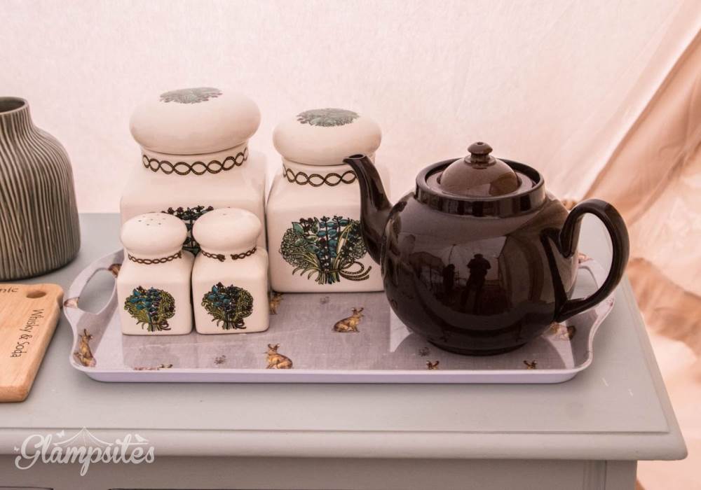 We provide a fire pit pack, containing firelighters, kindling and logs for the first night of your stay. Plus drinking water, a flask of boiling water and complimentary tea, coffee, sugar and condiments in your tent.