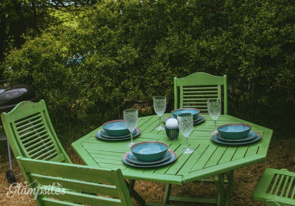 In your dedicated area of Bluebell Wood, you'll find solar stake lights and pretty festoon lights, a private compost toilet with washbasin, an outdoor dining table and chairs, a fire pit and a BBQ.
