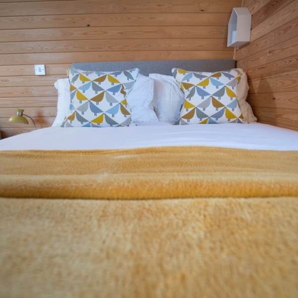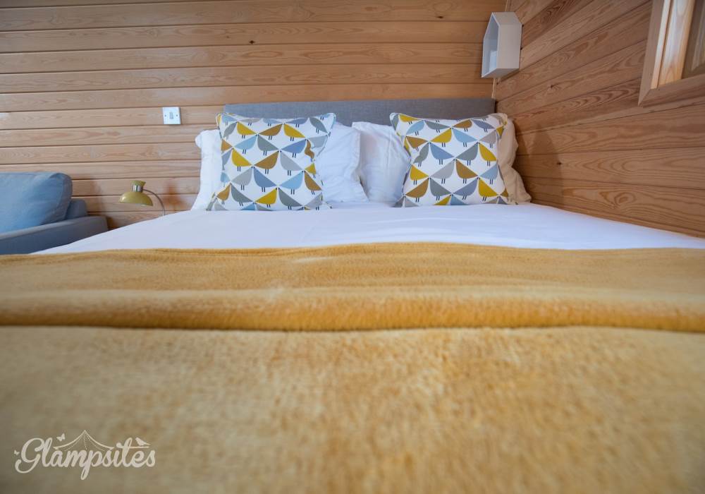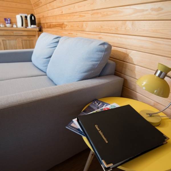 Cowslip pod has a double bed, with bedding & linen provided along with towels. It has a sofa bed, folding table & chairs, kitchenette with microwave, fridge with freezer space, toaster, kettle, coffee machine & sink, heated towel rail, wall heater, TV, hairdryer and smoke detector.