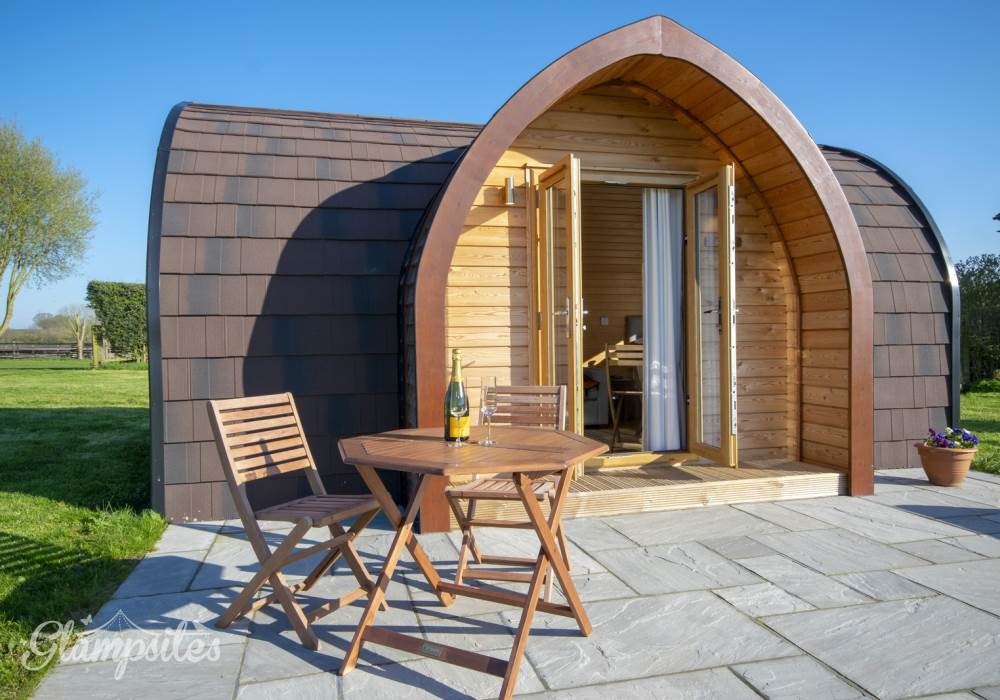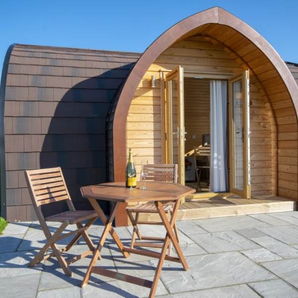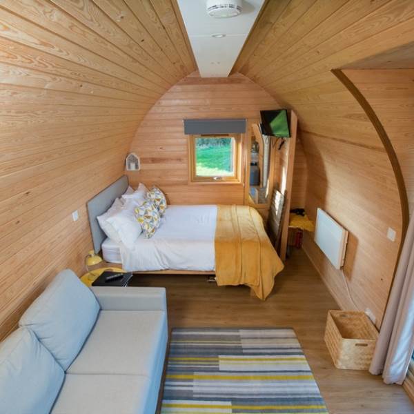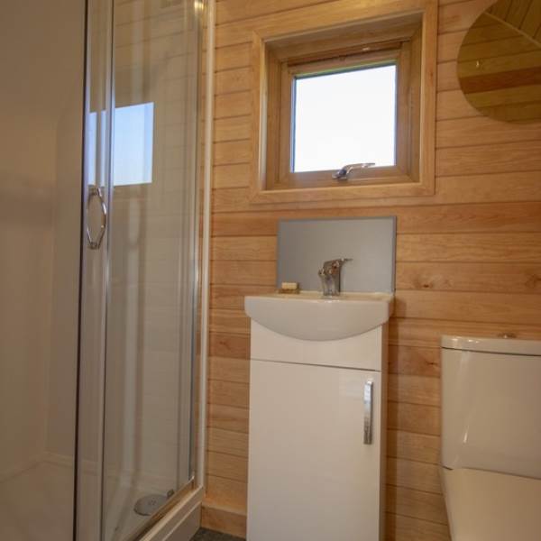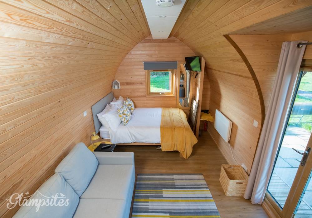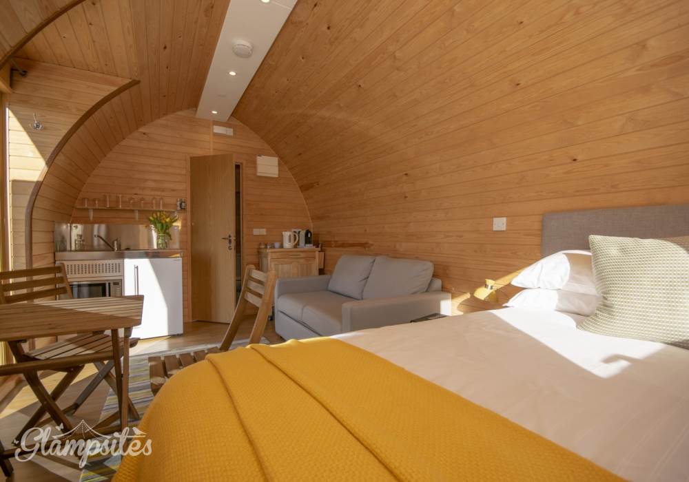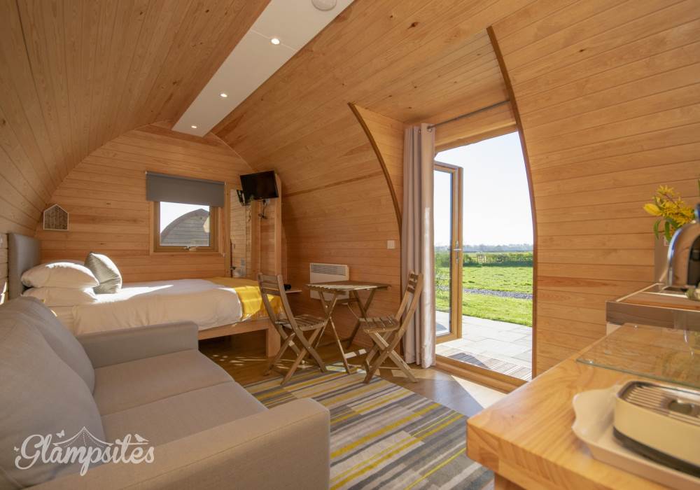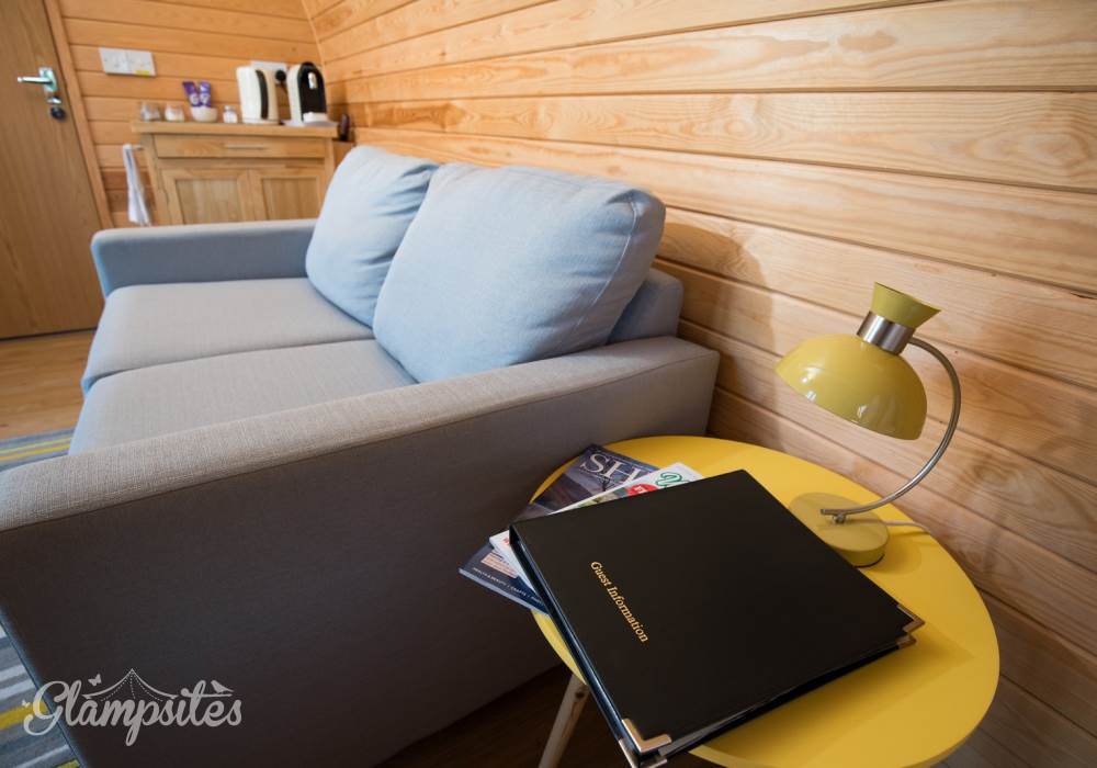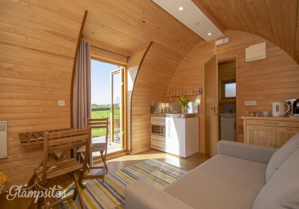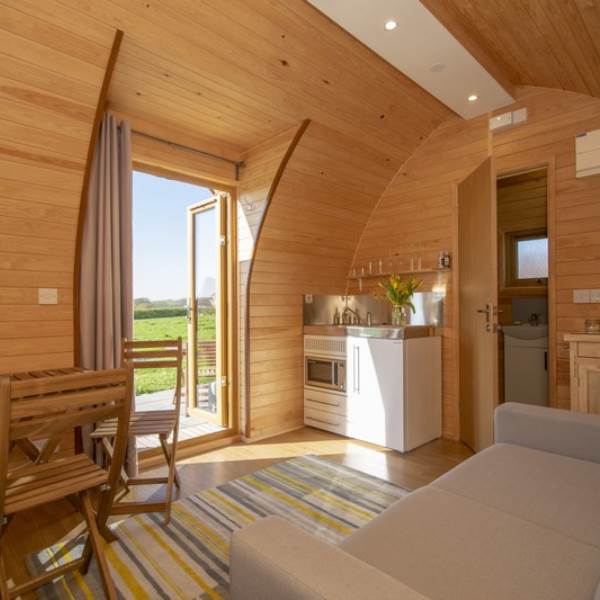 Cowslip Pod is furnished to a high standard with an en-suite with shower and sleeps 2. There are great views across to Malpas from the sofa.