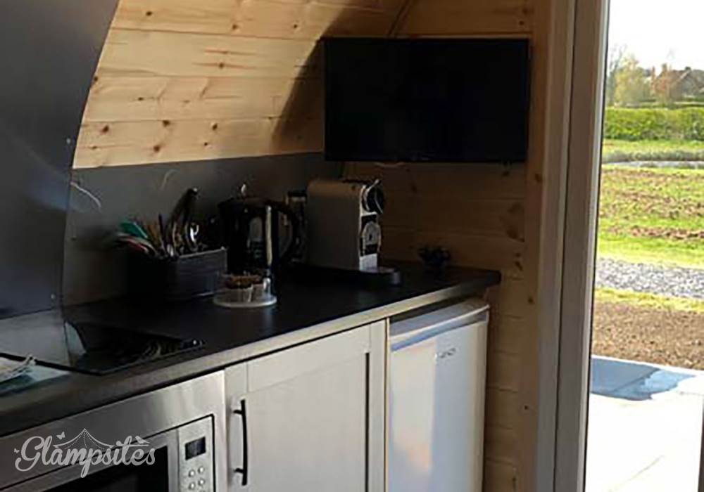 Honeysuckle pod has a double bed, with bedding & linen provided along with towels. A sofa bed (bed linen can be provided), kitchenette with microwave, fridge with freezer space, toaster, kettle, coffee machine & sink. The pod is kitted out with cutlery, crockery and other kitchen essentials. There is a TV, underfloor heating, heated towel rail, hair dryer and smoke detector.