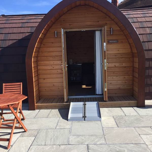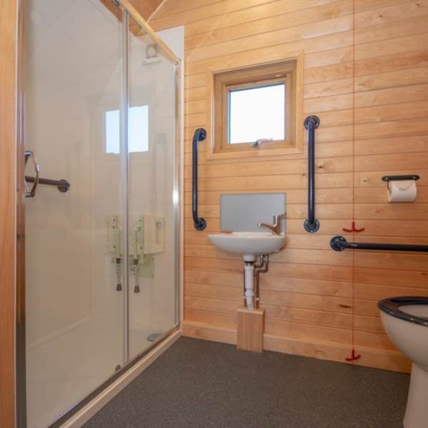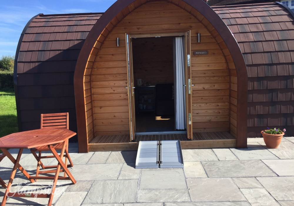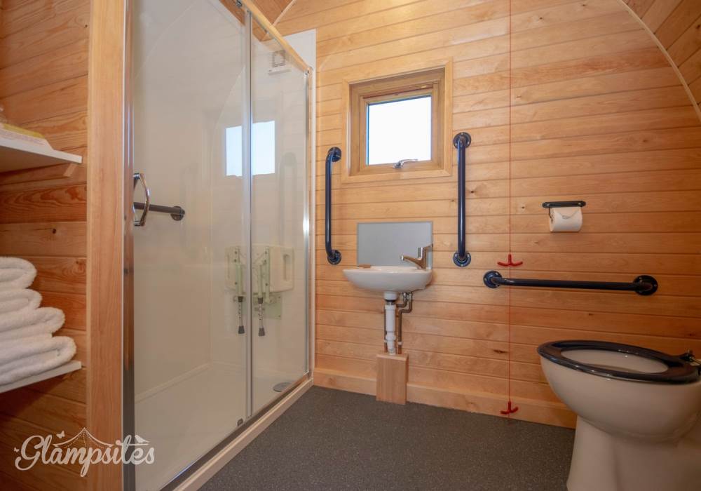 This pod is also suitable for someone with limited mobility and is wheelchair friendly, we can provide a foldable ramp. It has a larger bathroom with grab rails, shower seat and a call system.