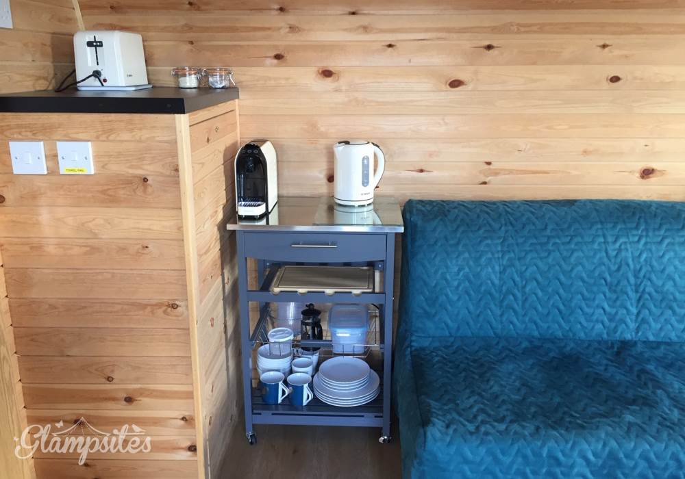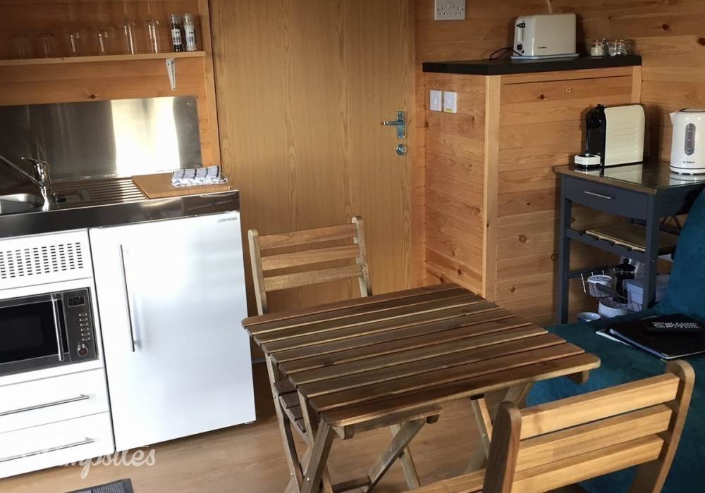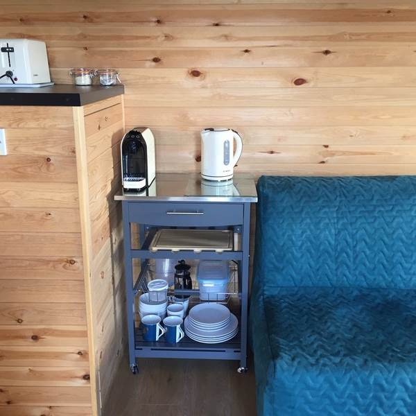 Meadowsweet pod has a double bed, with bedding & linen provided along with towels. There is a sofa bed (bedding can be provided), folding table & chairs, kitchenette with sink, microwave, fridge with freezer space, toaster, kettle & coffee machine. The pod is kitted out with cutlery, crockery and other kitchen essentials. There is a TV/DVD player, hairdryer, wall heater and smoke detector.