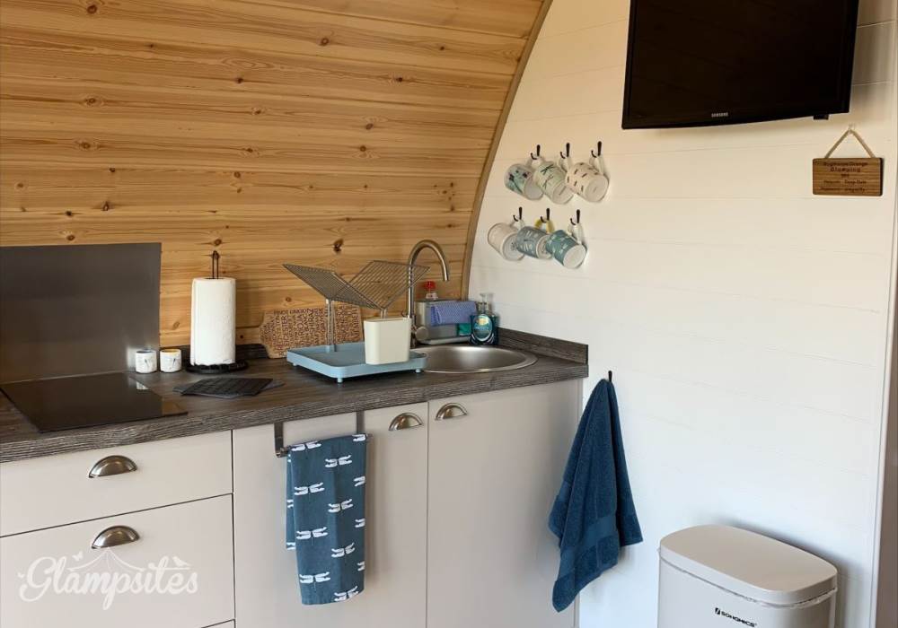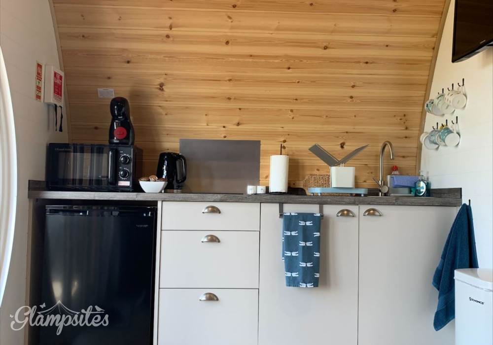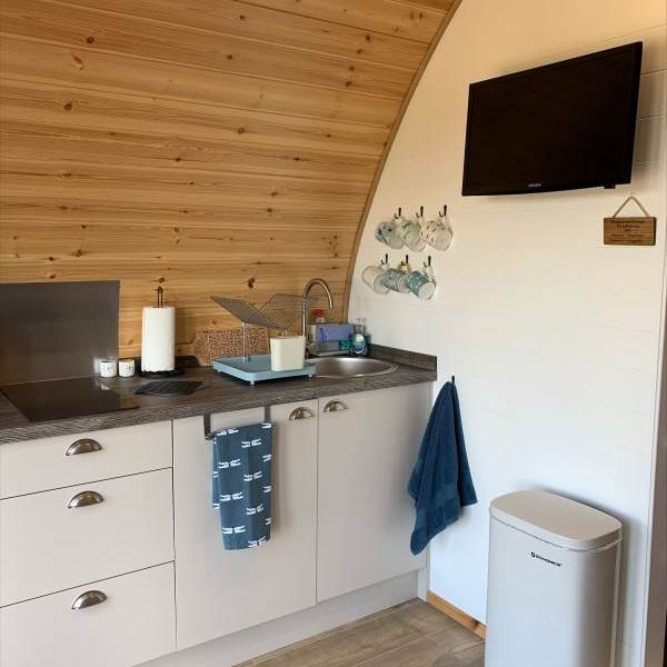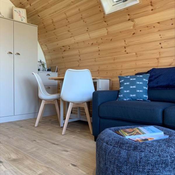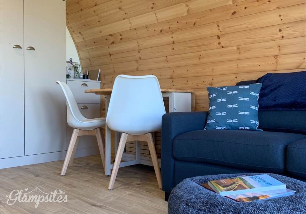 The living area includes a sofa (not a sofa bed), extendable dining table and chairs, smart TV, bluetooth speaker. WiFi is also available in the pod.