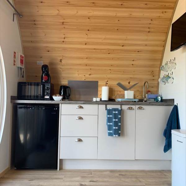 Kitchenette includes fridge with ice compartment, microwave, kettle, ceramic hob, toaster, coffee maker & a range of crockery, cutlery, cooking utensils etc. A welcome hamper including tea, coffee pods, milk & breakfast essentials is provided so remembering to call in at a shop on the way is not necessary.