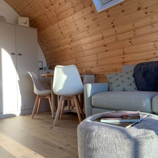 The living area includes a sofa (not a sofa bed), extendable dining table and chairs, smart TV, bluetooth speaker. WiFi is also available in the pod.