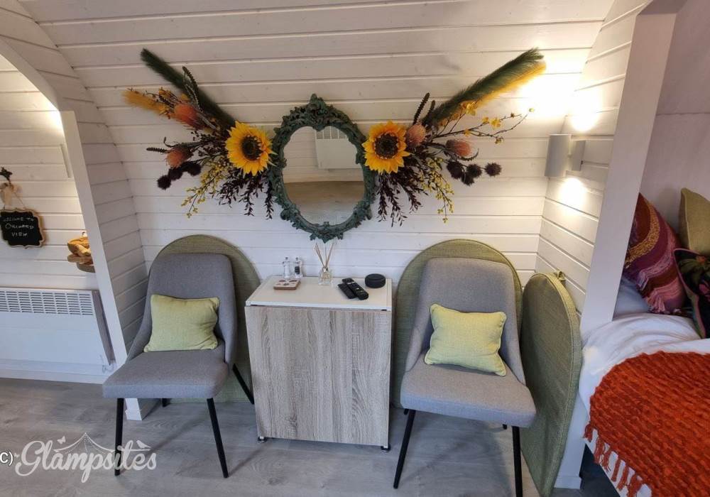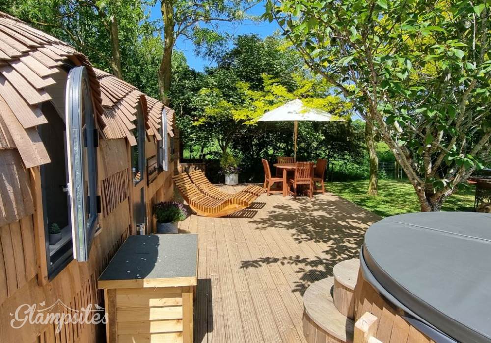 Orchard View – 'the iglu in the orchard'. Set in its own ¼ acre private orchard, with King size bed providing luxurious accommodation for a maximum of 2 adults. The cabin is fully insulated and heated, keeping you warm in the cooler evenings or winter months.