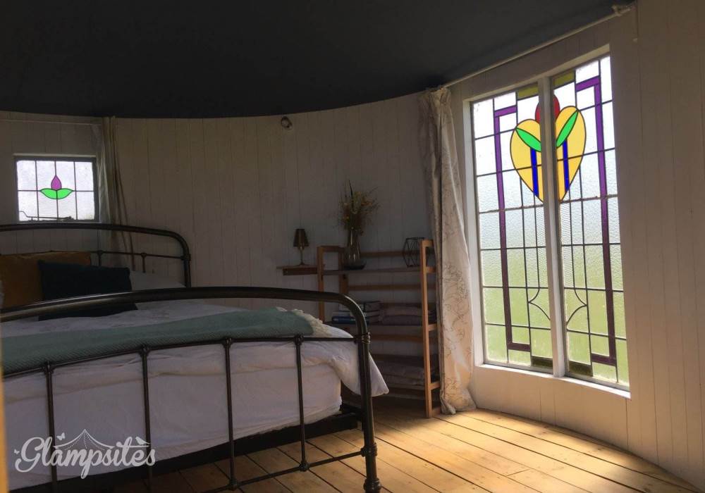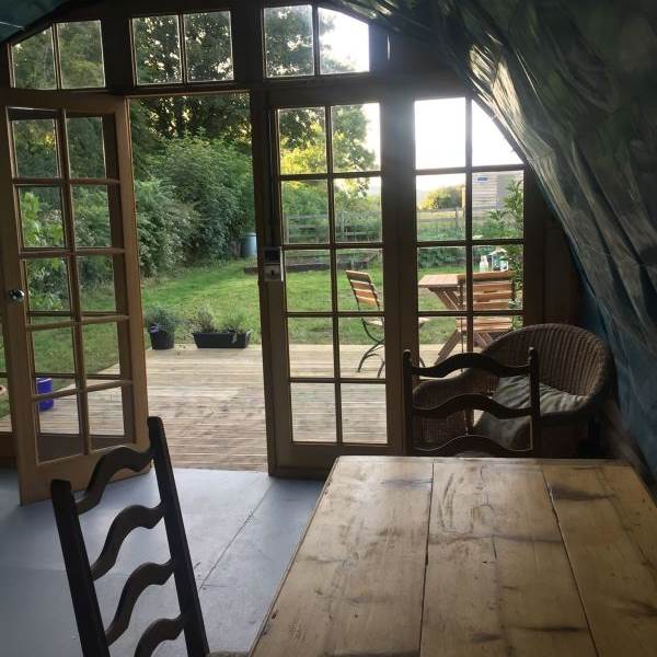 The Queen of Hearts Yurt enjoys a slightly elevated position and views of the valley. The handcrafted wooden and metal structure features antique windows, Victorian floorboards and a sky light to enjoy the stars. It's lovingly furnished with a king-size bed and two comfy chairs. A wood burning stove ensures you stay warm and cosy even on colder evenings. We provide bedding and linen, towels, firewood and spaces to hang or store your clothes. Soft lighting in the accommodation is powered by solar panels. Outside the yurt there is a table, chairs and firebowl.
