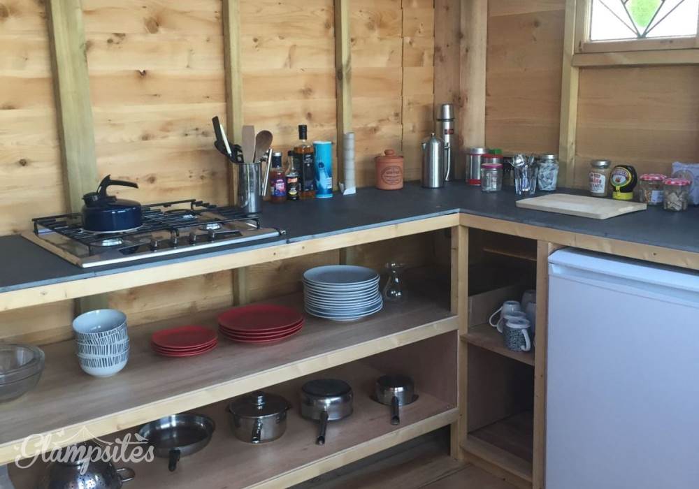 Within the glamping site our hand built kitchen is equipped with everything you need to prepare a meal, including gas hob, fridge freezer, kettle, toaster and hot water.
