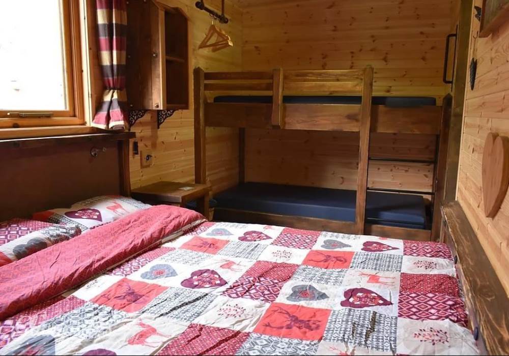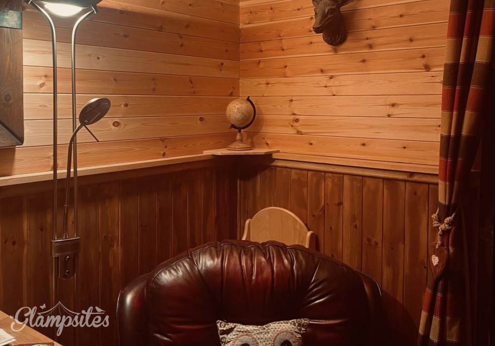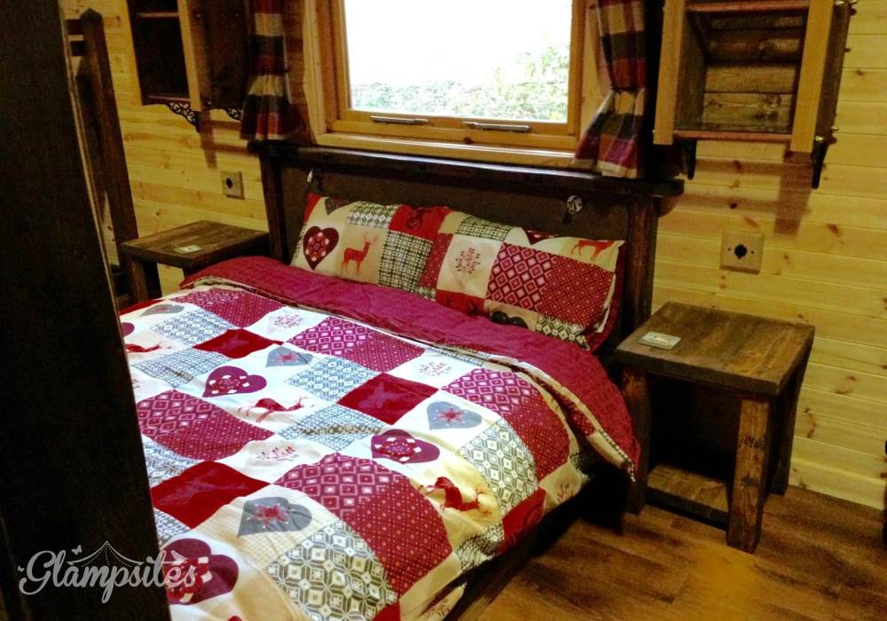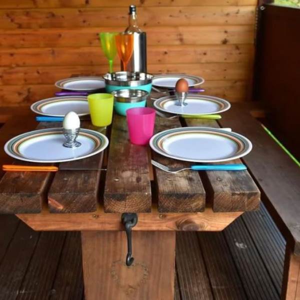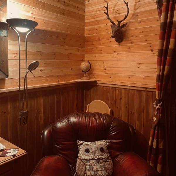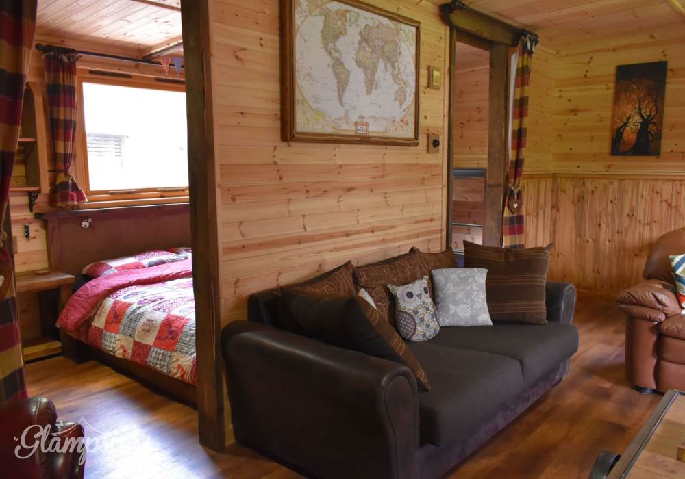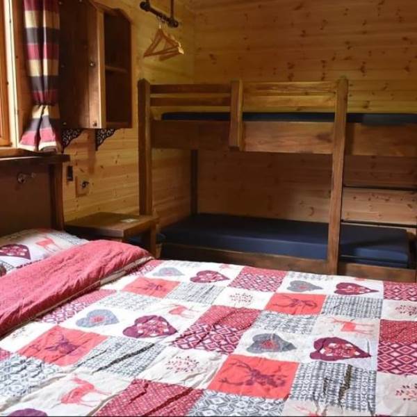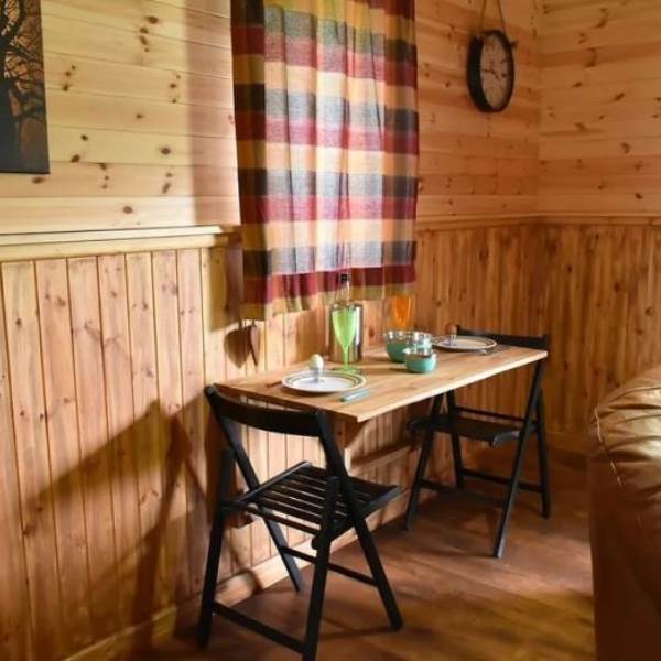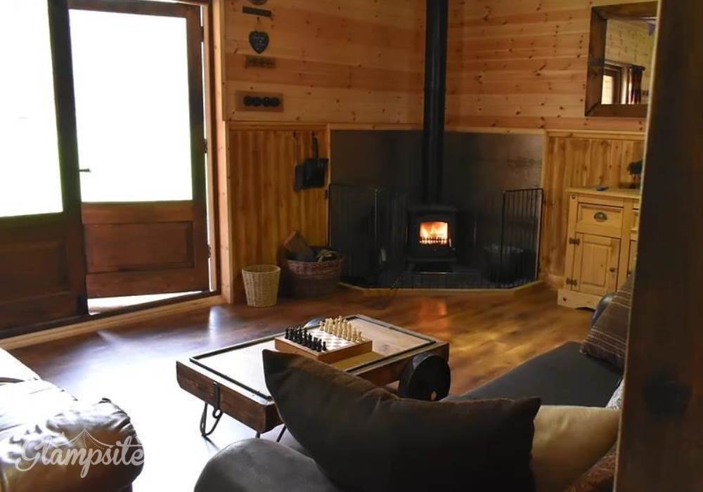 The Cabin has a Kingsize Memory Foam Bed and two sets of (Full Sized) Single Bunk Beds - all hand built by Rob, even an earthquake would be pushed to move these beds. Rob's attention to detail is second to none - from the hand built shelving to the reading lights so thoughtfully placed in the headboard of the main bed. The living area is filled with comfortable sofas and chairs with the main feature being a close call between the cosy log burner or the rustic, one-of-a-kind, coffee table built by Rob. We will let you choose your favourite feature when you visit!!