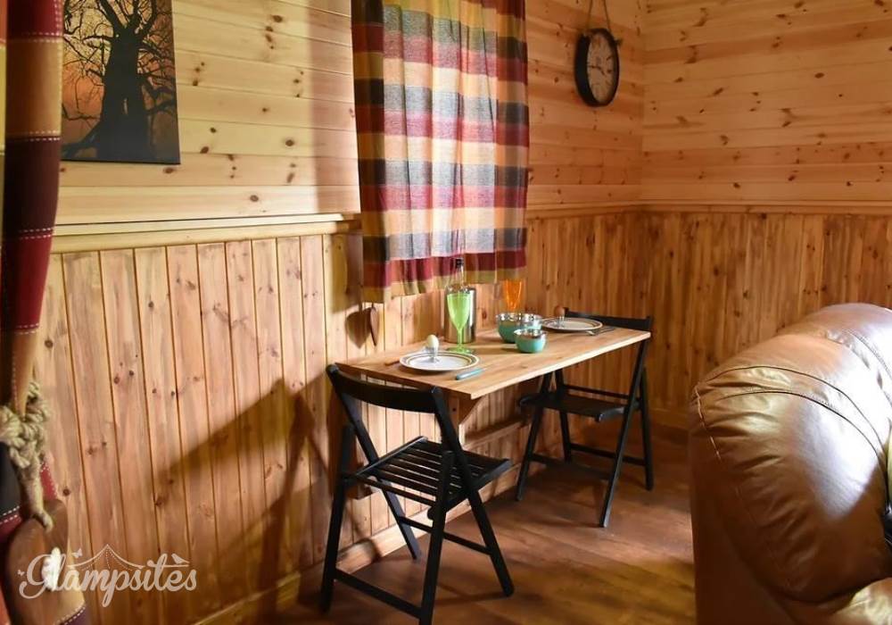 The Cabin is Robs own version of the popular Eco Pod and offers solar powered lighting, full insulation and has a log burner for heating. New for 2024 the cabin now has mains powered electrical points allowing use of hairdryers, toasters, kettles and other electrical times.