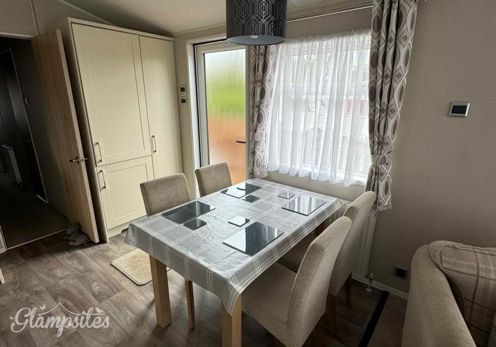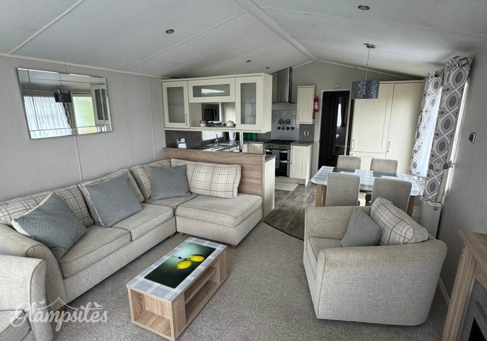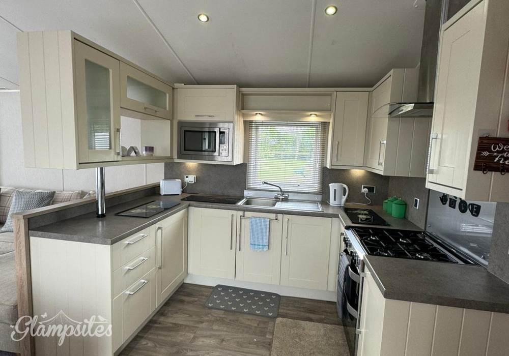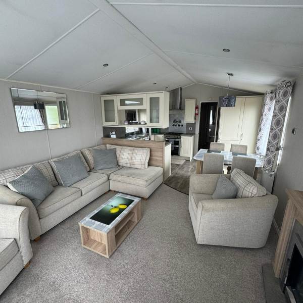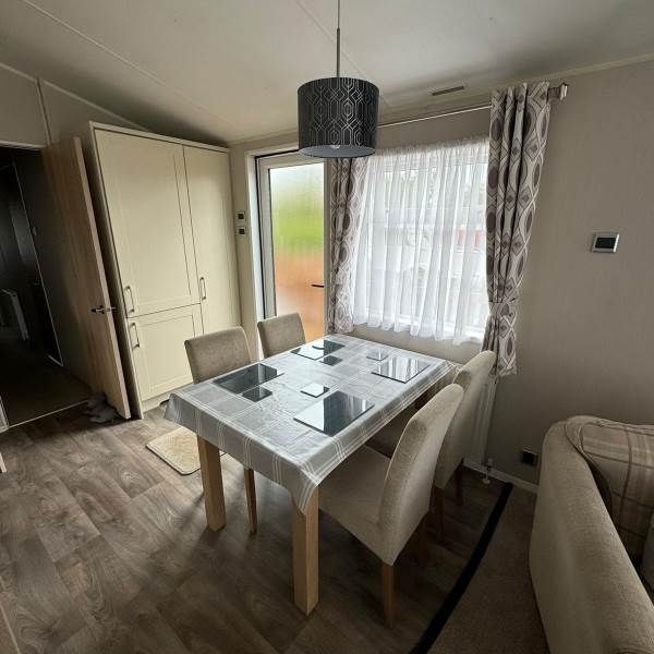The decking area is accessed from the courtyard and leads into the lodge entering into the kitchen diner. The kitchen diner is open plan and leads into the living room area. In the living room there is a 32" TV, coffee table, corner settee and two armchairs. Patio doors in the living room also lead out onto a Juliet balcony.