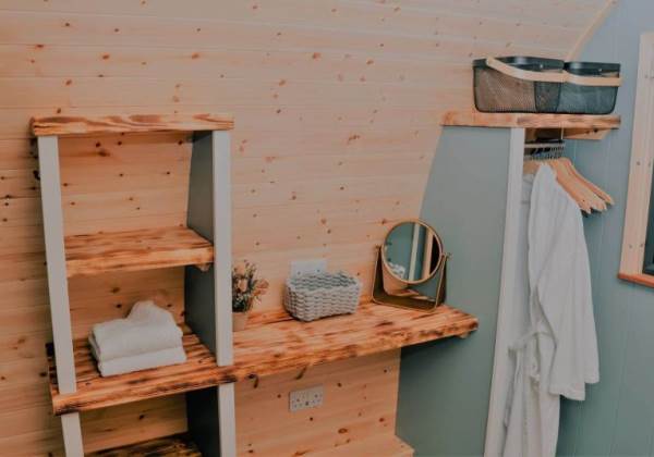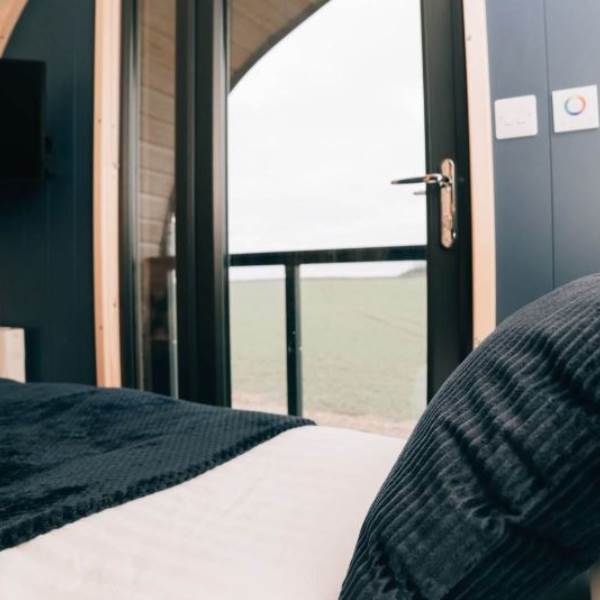A fully-equipped kitchen awaits you in this pod and includes a microwave combi oven, fridge freezer, toaster, kettle, dishwasher and induction hob. Table and benches provide a space for guests to relax and enjoy their mealtimes. Electric and USB charging sockets are on hand for the convenience of our guests, enabling them to charge their devices.